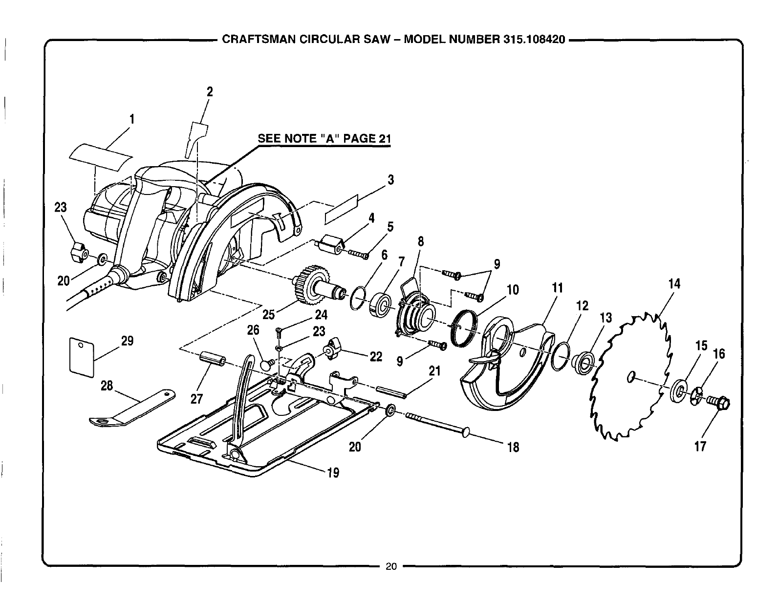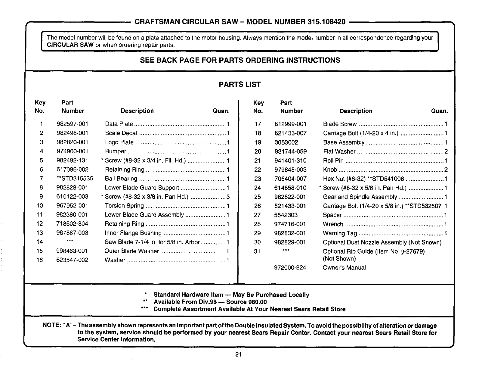 User Manual: Craftsman 315108420 315108420 CRAFTSMAN CIRCULAR SAW - Manuals and Guides View the owners manual for your CRAFTSMAN CIRCULAR SAW #315108420. Home:Tool Parts:Craftsman Parts:Craftsman CIRCULAR SAW Manual