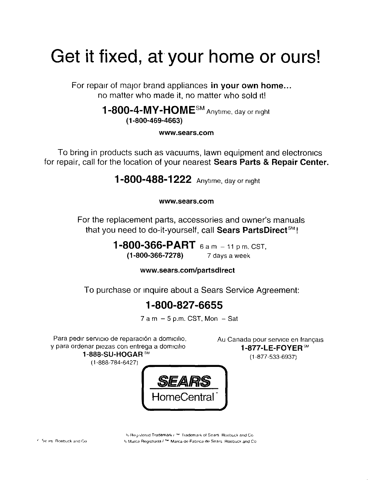 for repair, call for the location of your nearest Sears Parts & Repair Center.