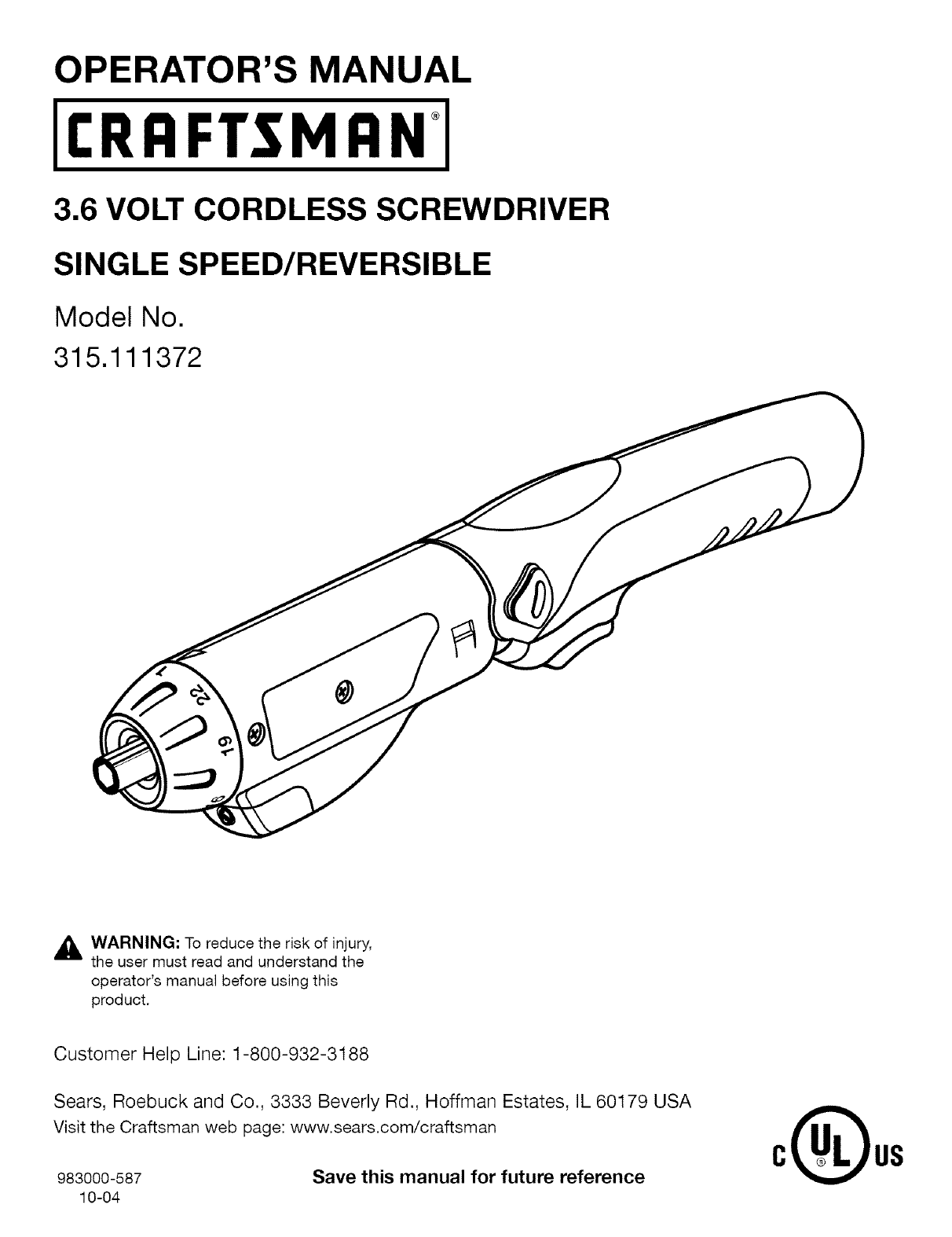 Craftsman 315111372 User Manual SCREWDRIVER Manuals And Guides L0410284