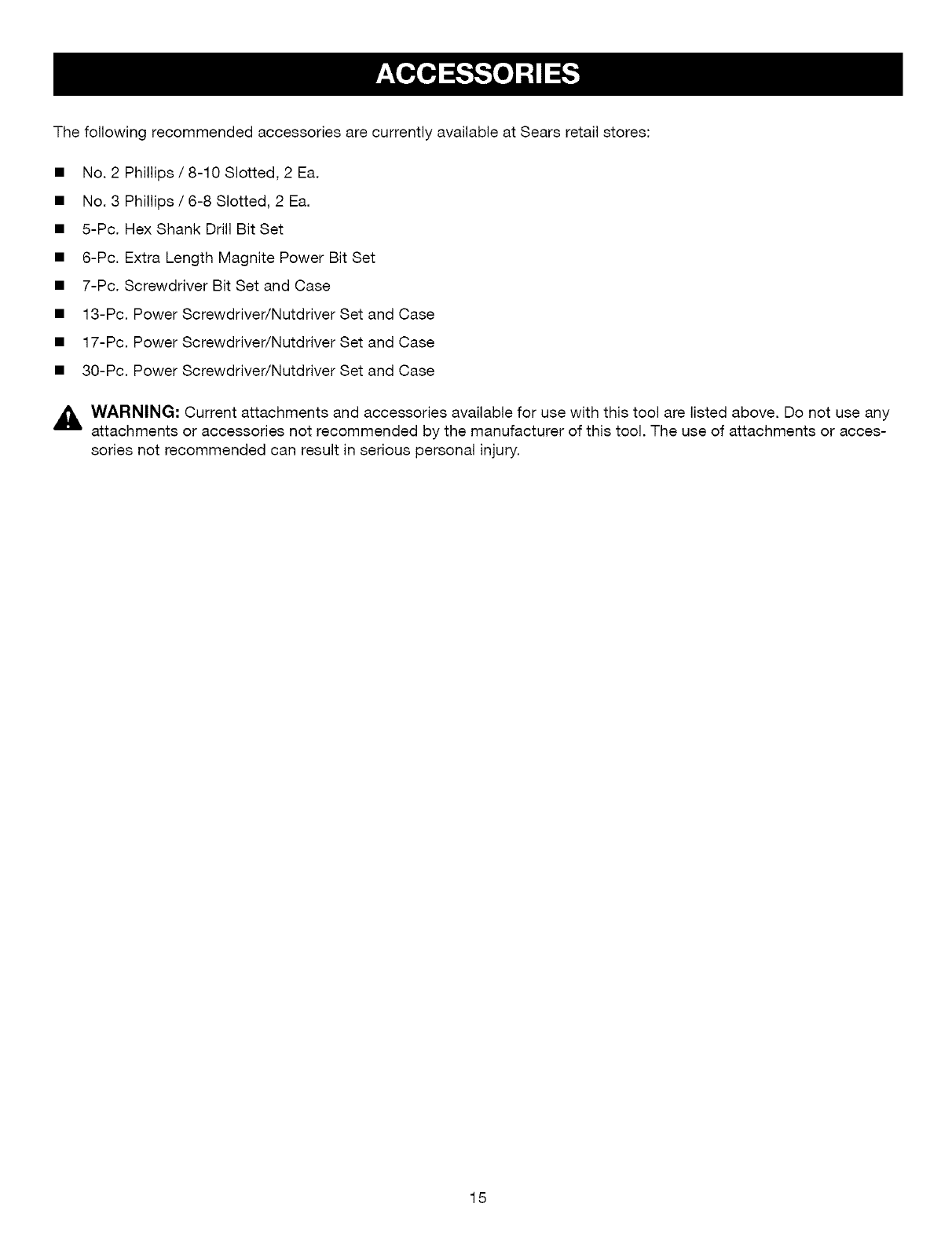 ,_ WARNING: Current attachments and accessories available for use with this tool are listed above. Do not use any