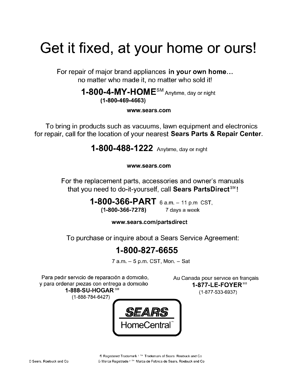 for repair, call for the location of your nearest Sears Parts & Repair Center.