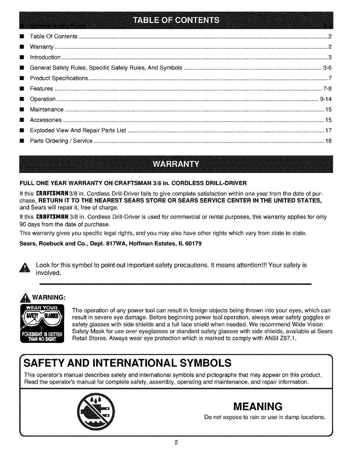 FULL ONE YEAR WARRANTY ON CRAFTSMAN 3/8 in. CORDLESS DRILL-DRWER