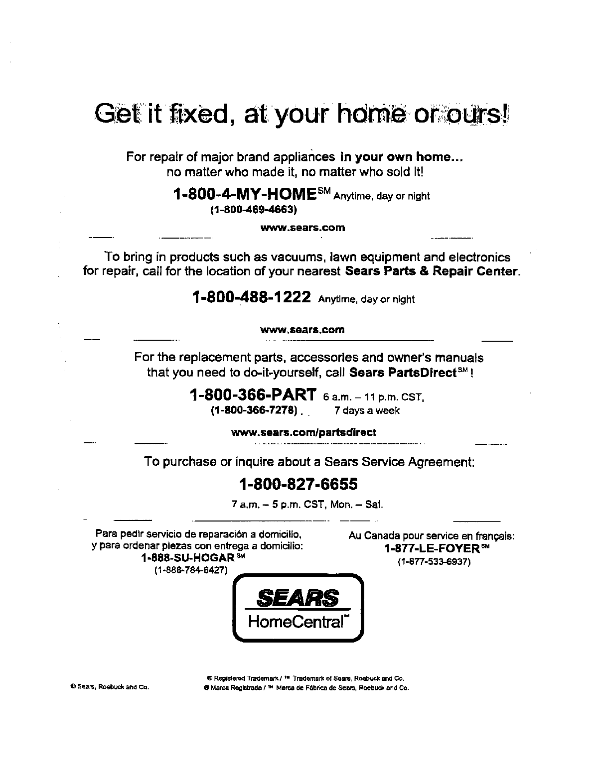 for repair, call for the location of your nearest Sears Parts & Repair Center.