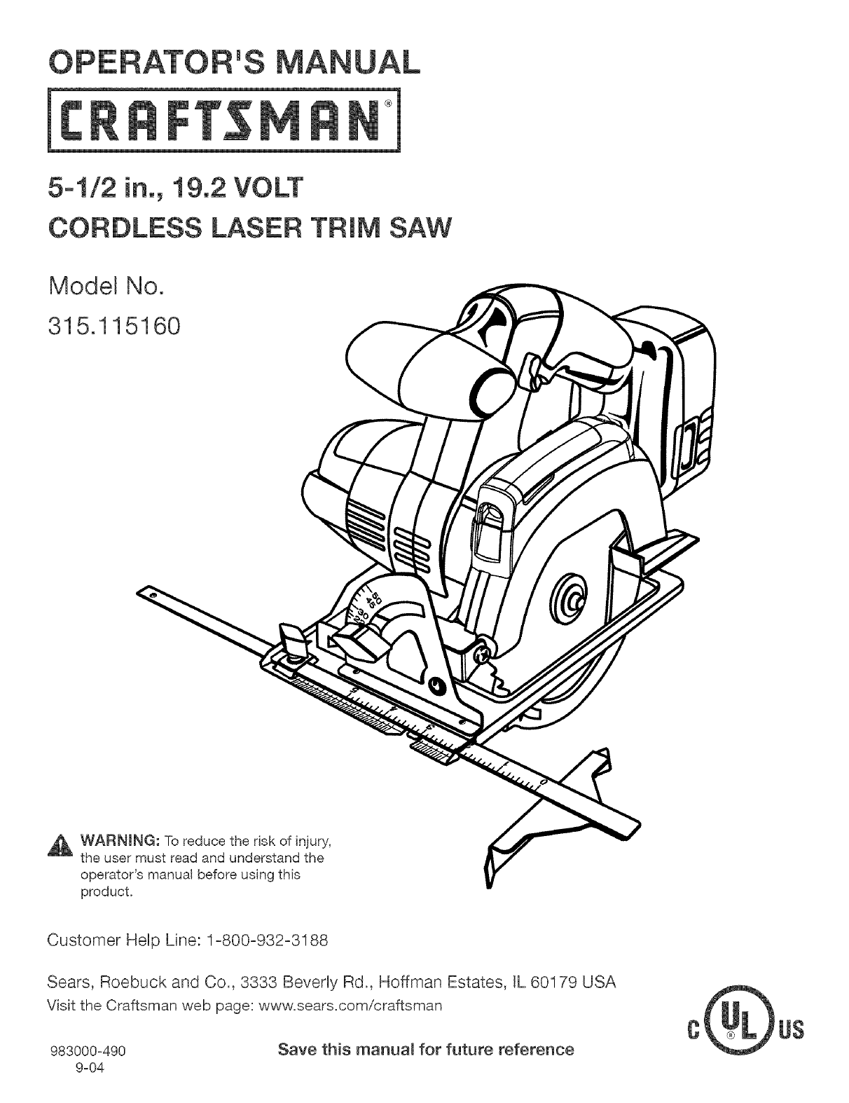 User Manual: Craftsman 315115160 315115160 CRAFTSMAN TRIM SAW - Manuals and Guides View the owners manual for your CRAFTSMAN TRIM SAW #315115160. Home:Tool Parts:Craftsman Parts:Craftsman TRIM SAW Manual