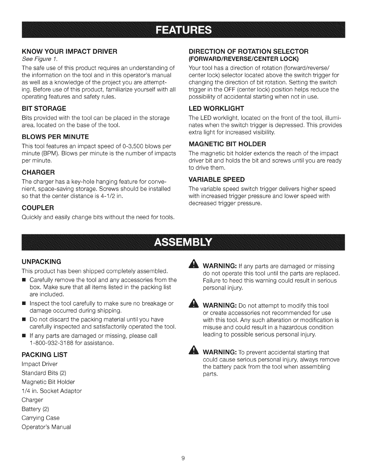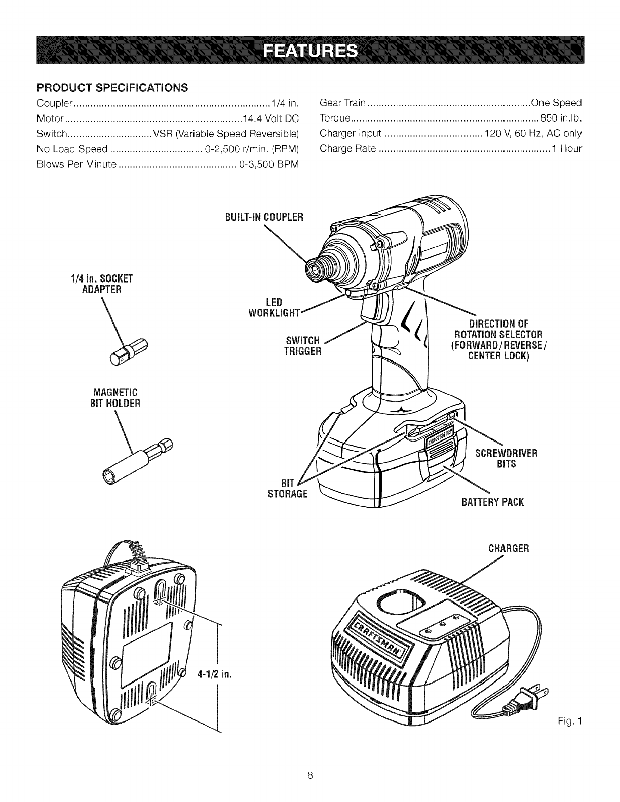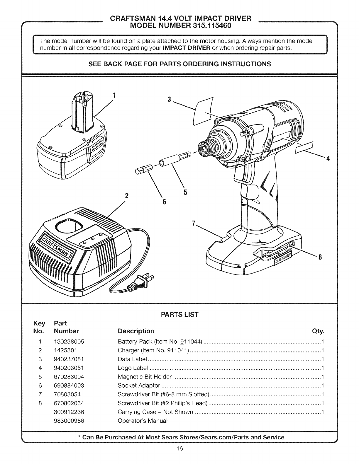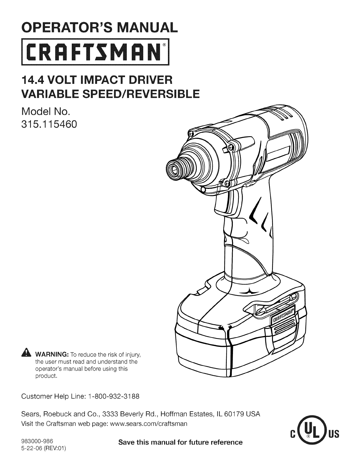 User Manual: Craftsman 315115460 315115460 CRAFTSMAN 14.4 VOLT IMPACT DRIVER - Manuals and Guides View the owners manual for your CRAFTSMAN 14.4 VOLT IMPACT DRIVER #315115460. Home:Tool Parts:Craftsman Parts:Craftsman 14.4 VOLT IMPACT DRIVER Manual