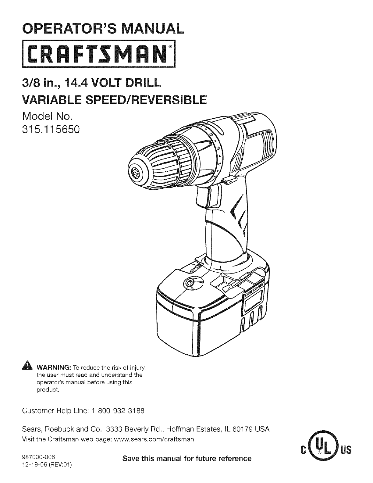 User Manual: Craftsman 315115650 315115650 CRAFTSMAN DRILL - Manuals and Guides View the owners manual for your CRAFTSMAN DRILL #315115650. Home:Tool Parts:Craftsman Parts:Craftsman DRILL Manual