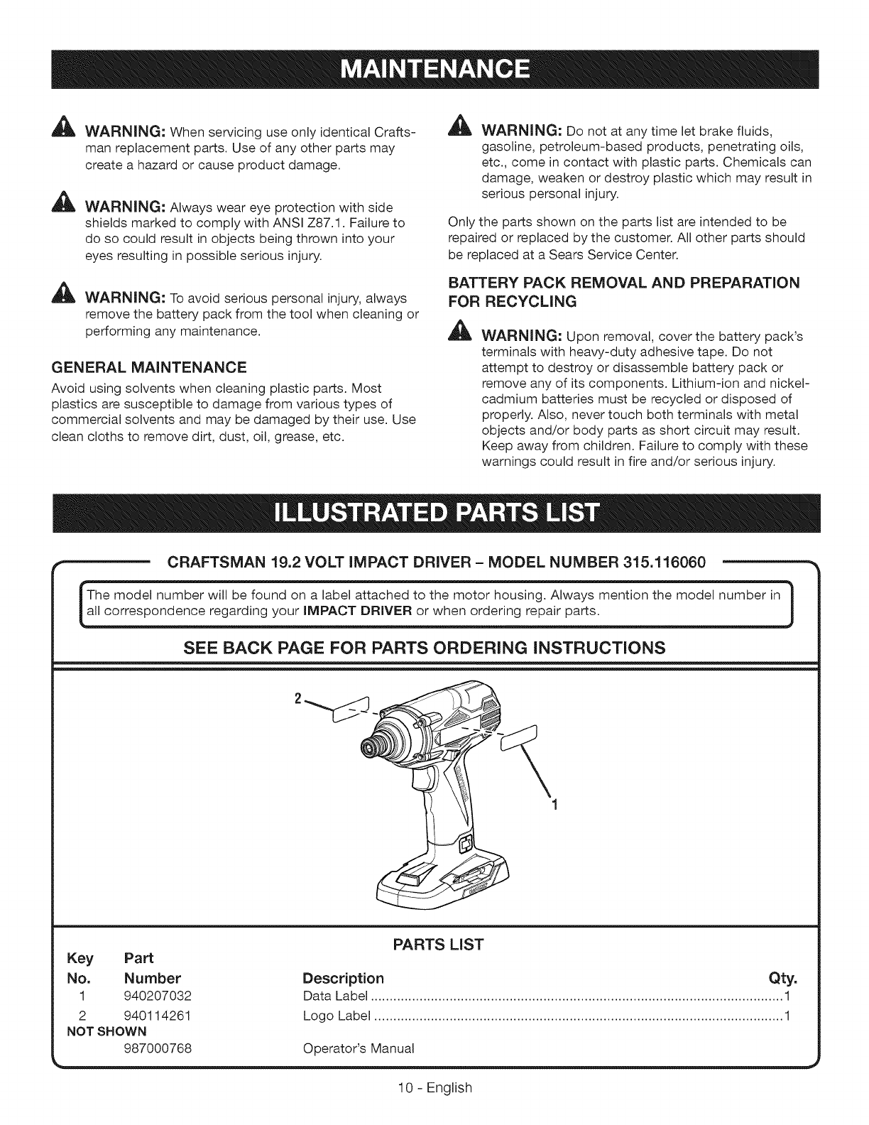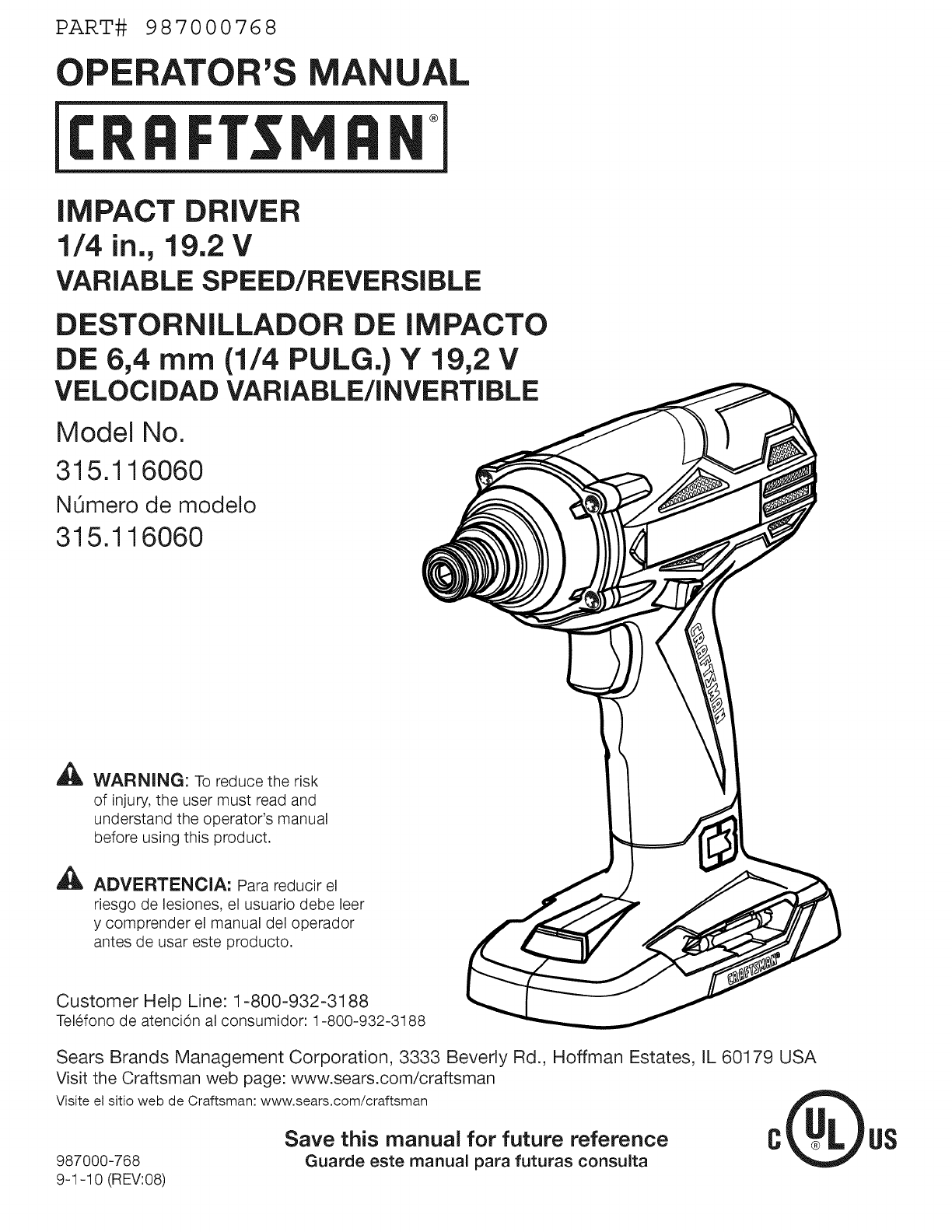 User Manual: Craftsman 315116060 315116060 CRAFTSMAN DRILL DRIVER - Manuals and Guides View the owners manual for your CRAFTSMAN DRILL DRIVER #315116060. Home:Tool Parts:Craftsman Parts:Craftsman DRILL DRIVER Manual