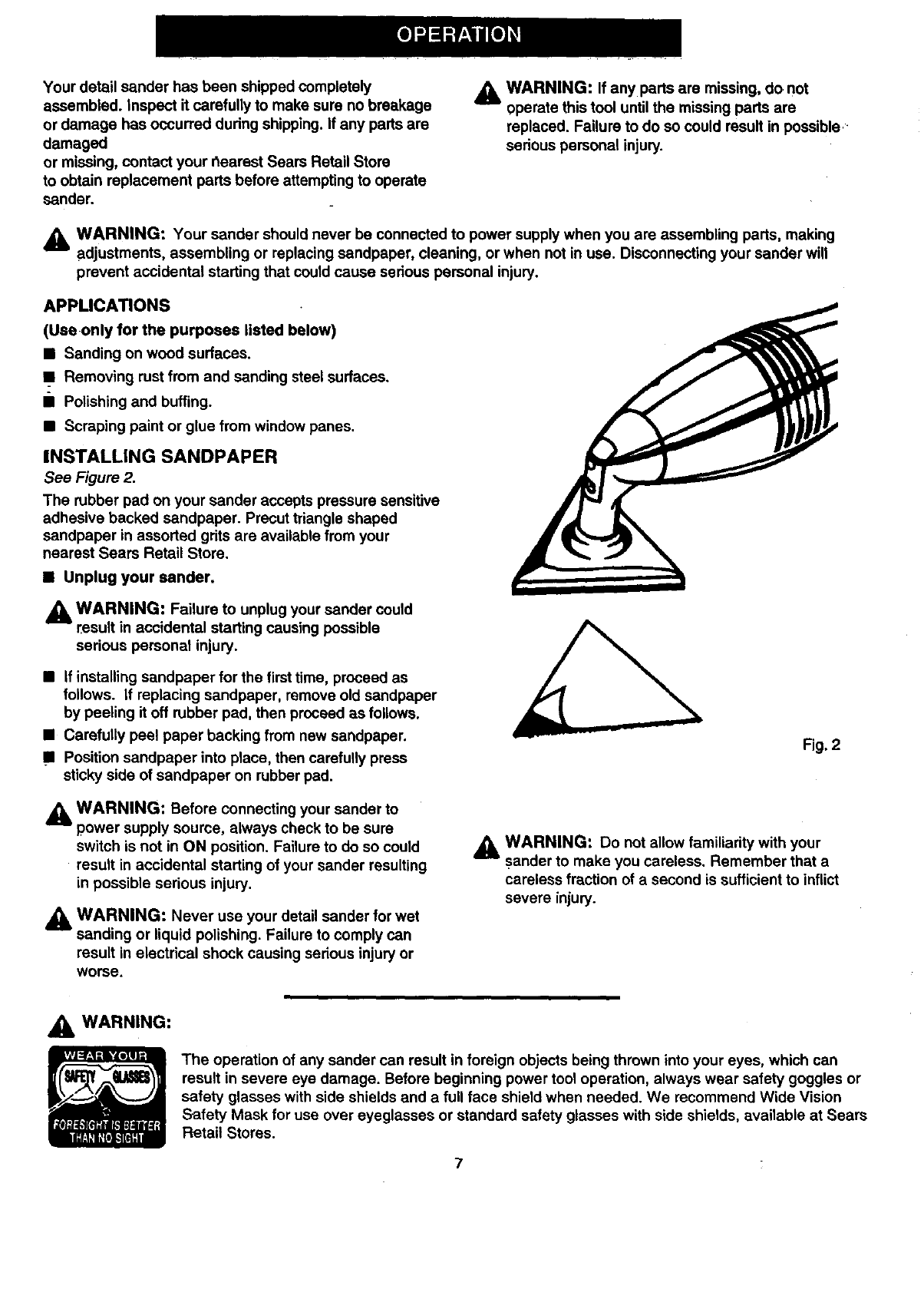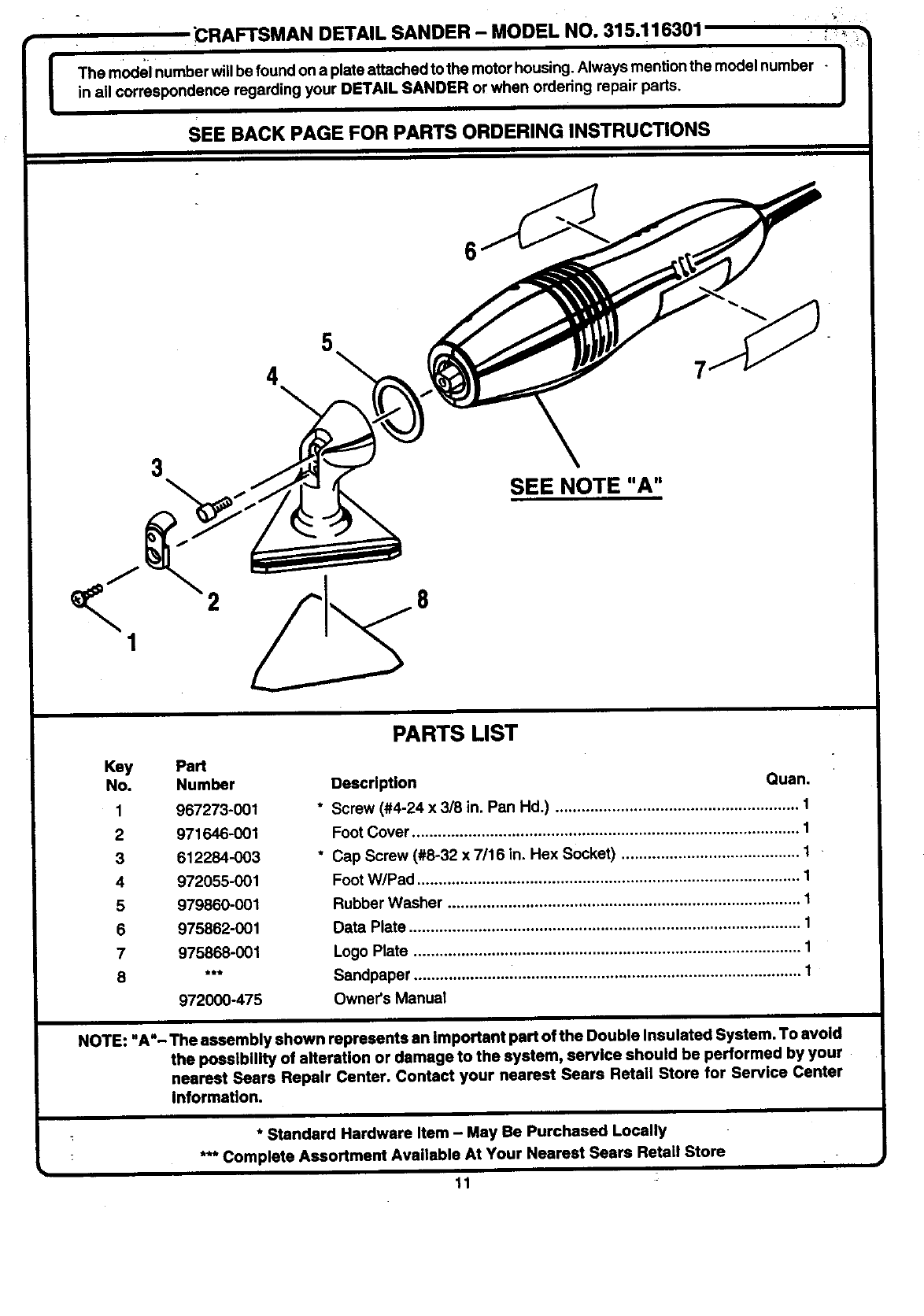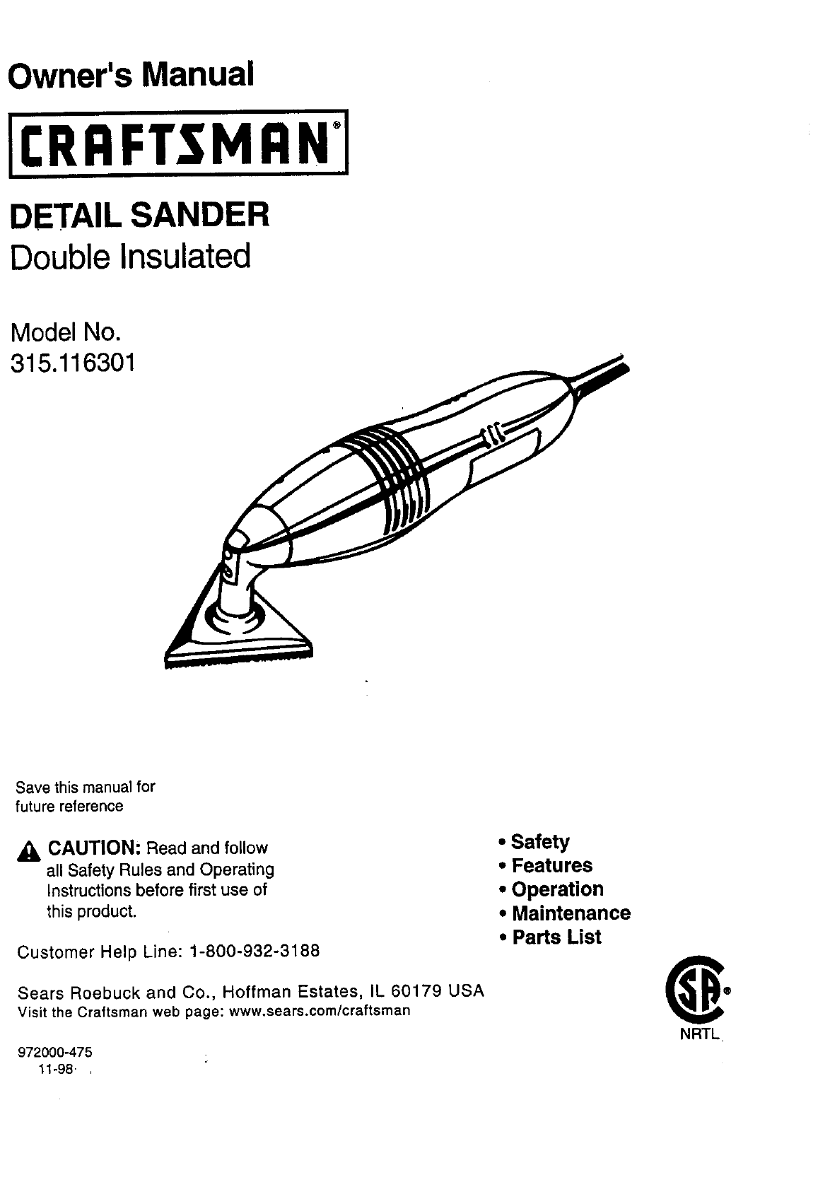 User Manual: Craftsman 315116301 315116301 CRAFTSMAN DETAIL SANDER - Manuals and Guides View the owners manual for your CRAFTSMAN DETAIL SANDER #315116301. Home:Tool Parts:Craftsman Parts:Craftsman DETAIL SANDER Manual
