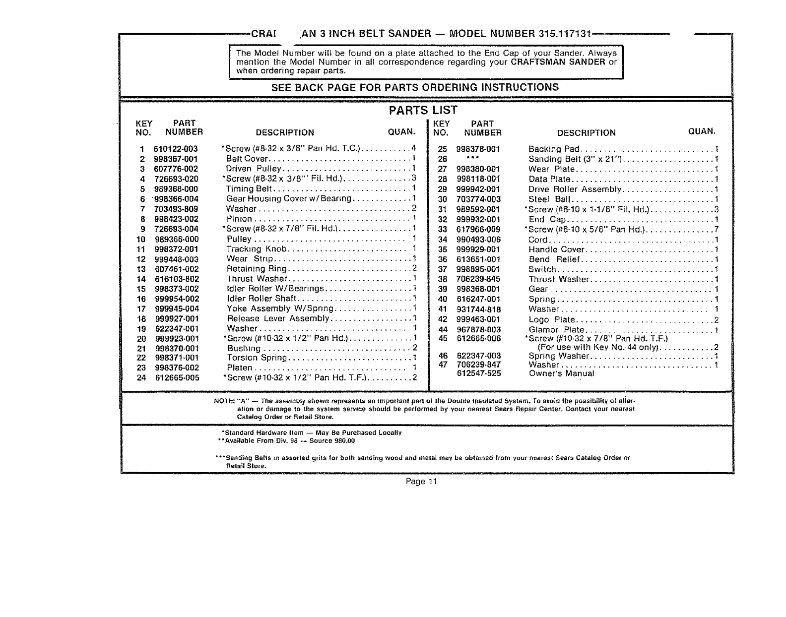 User Manual: Craftsman 315117131 315117131 CRAFTSMAN CRAFTSMAN 3 IN BELT SANDER - Manuals and Guides View the owners manual for your CRAFTSMAN CRAFTSMAN 3 IN BELT SANDER #315117131. Home:Tool Parts:Craftsman Parts:Craftsman CRAFTSMAN 3 IN BELT SANDER Manual