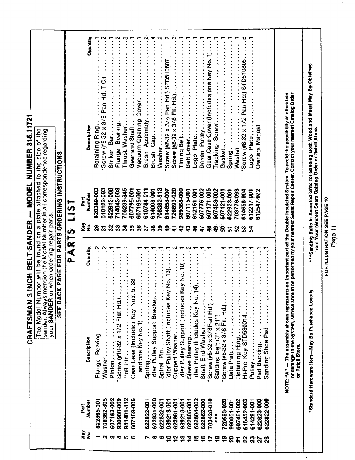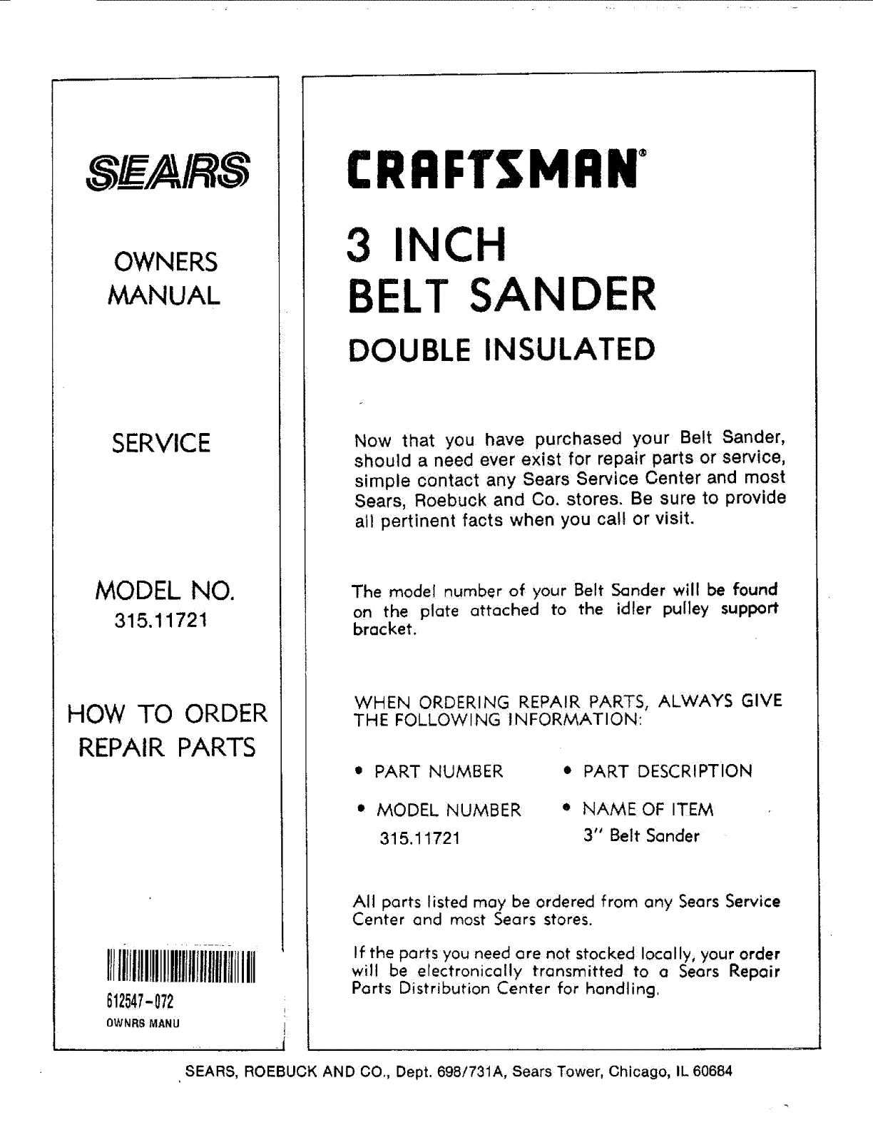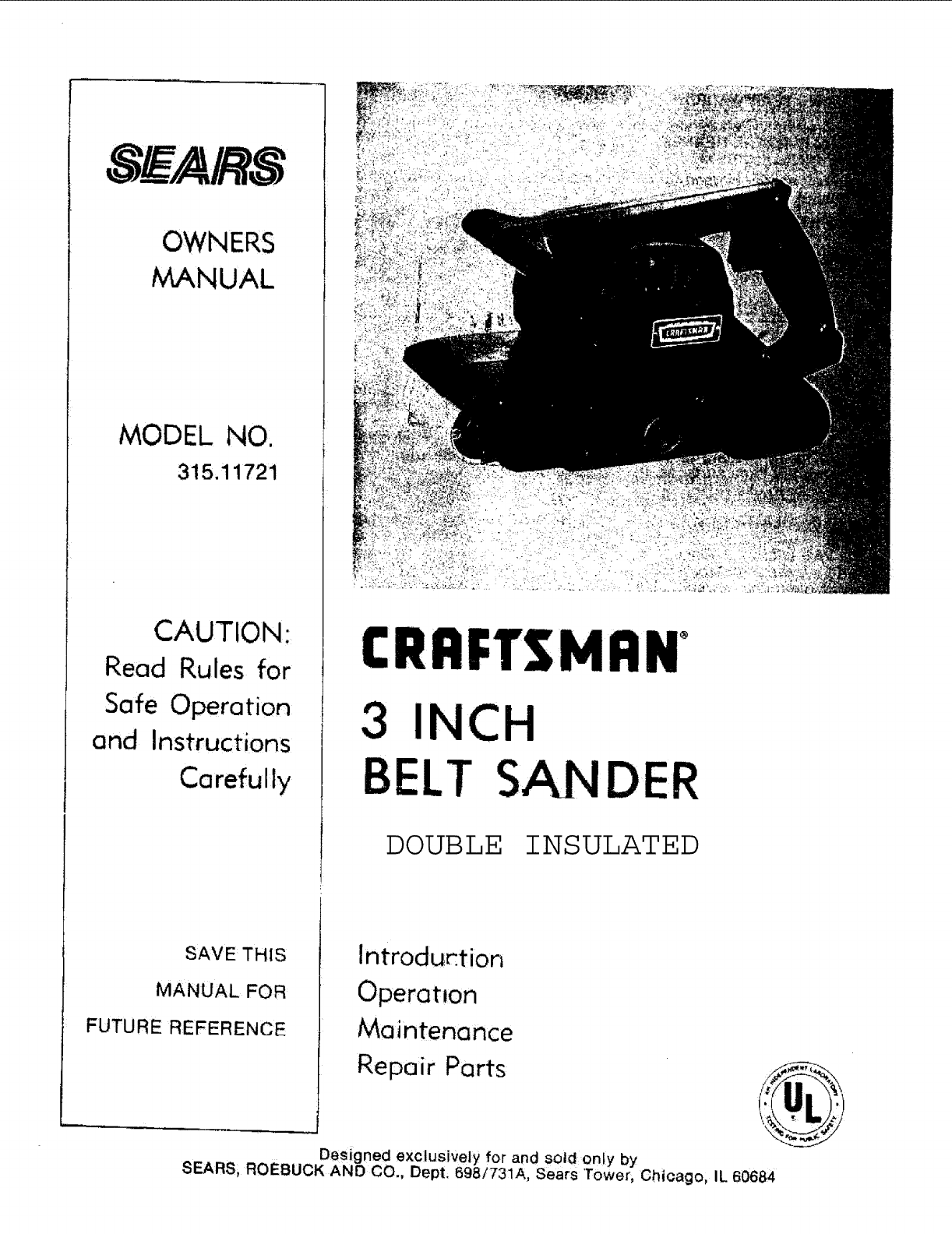User Manual: Craftsman 31511721 31511721 CRAFTSMAN CRAFTSMAN 3 INCH BELT SANDER - Manuals and Guides View the owners manual for your CRAFTSMAN CRAFTSMAN 3 INCH BELT SANDER #31511721. Home:Tool Parts:Craftsman Parts:Craftsman CRAFTSMAN 3 INCH BELT SANDER Manual