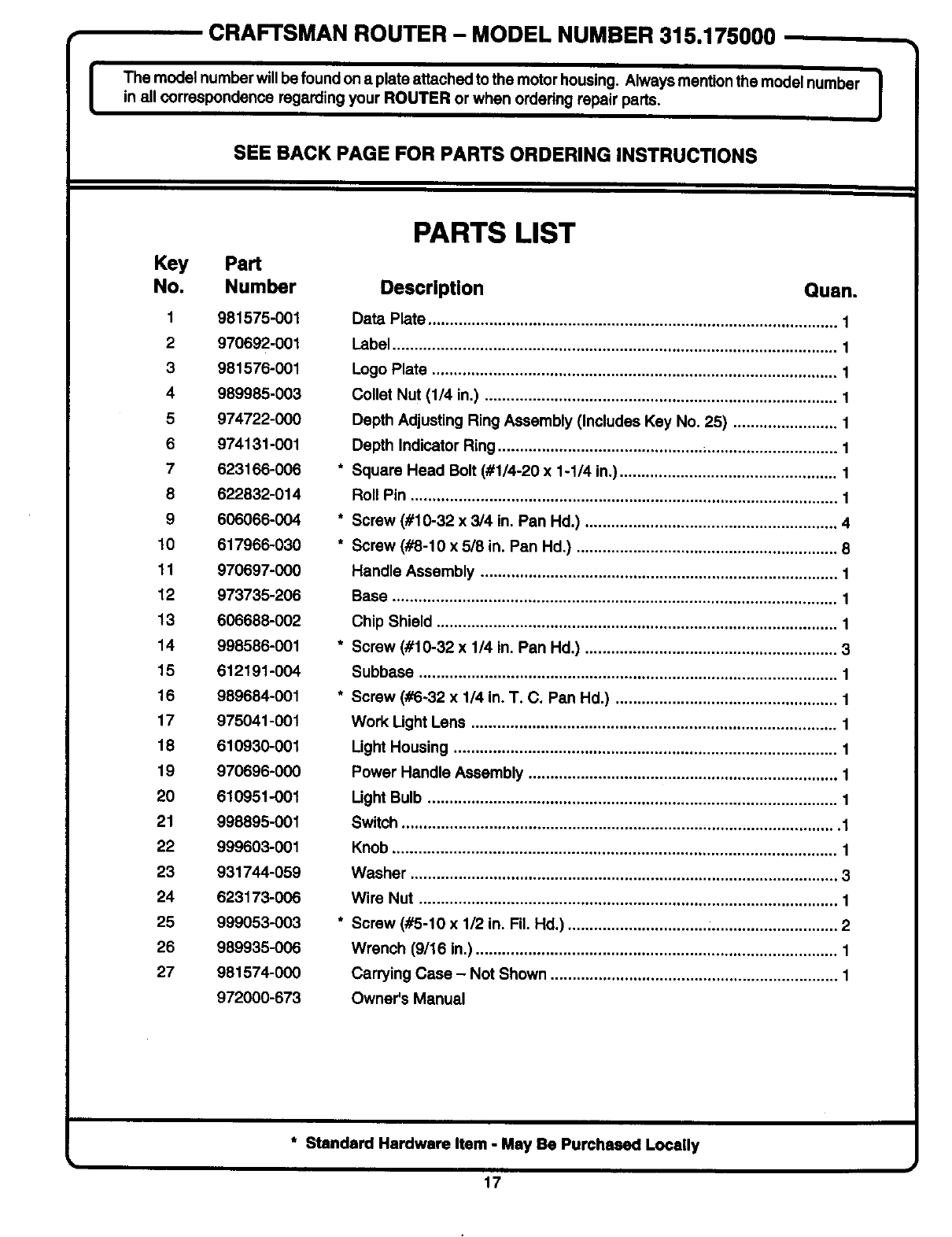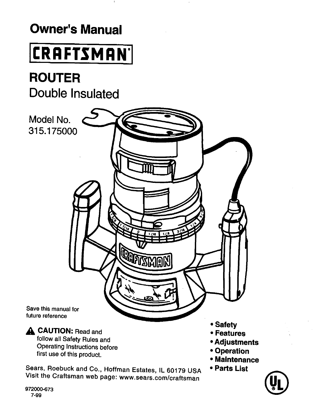User Manual: Craftsman 315175000 315175000 CRAFTSMAN CRAFTSMAN ROUTER - Manuals and Guides View the owners manual for your CRAFTSMAN CRAFTSMAN ROUTER #315175000. Home:Tool Parts:Craftsman Parts:Craftsman CRAFTSMAN ROUTER Manual