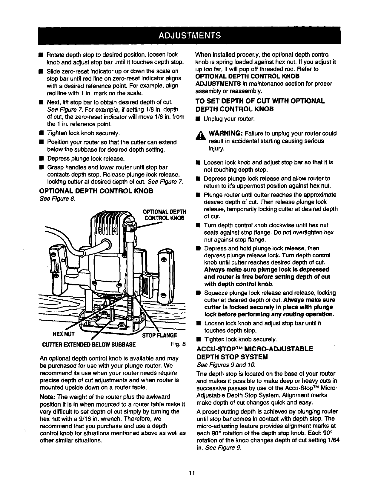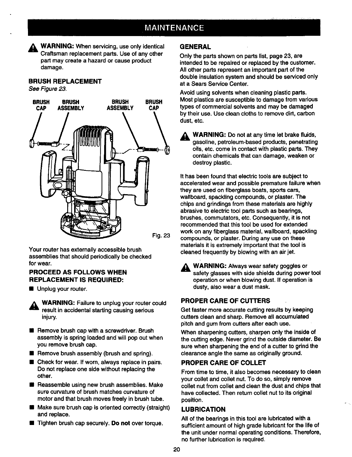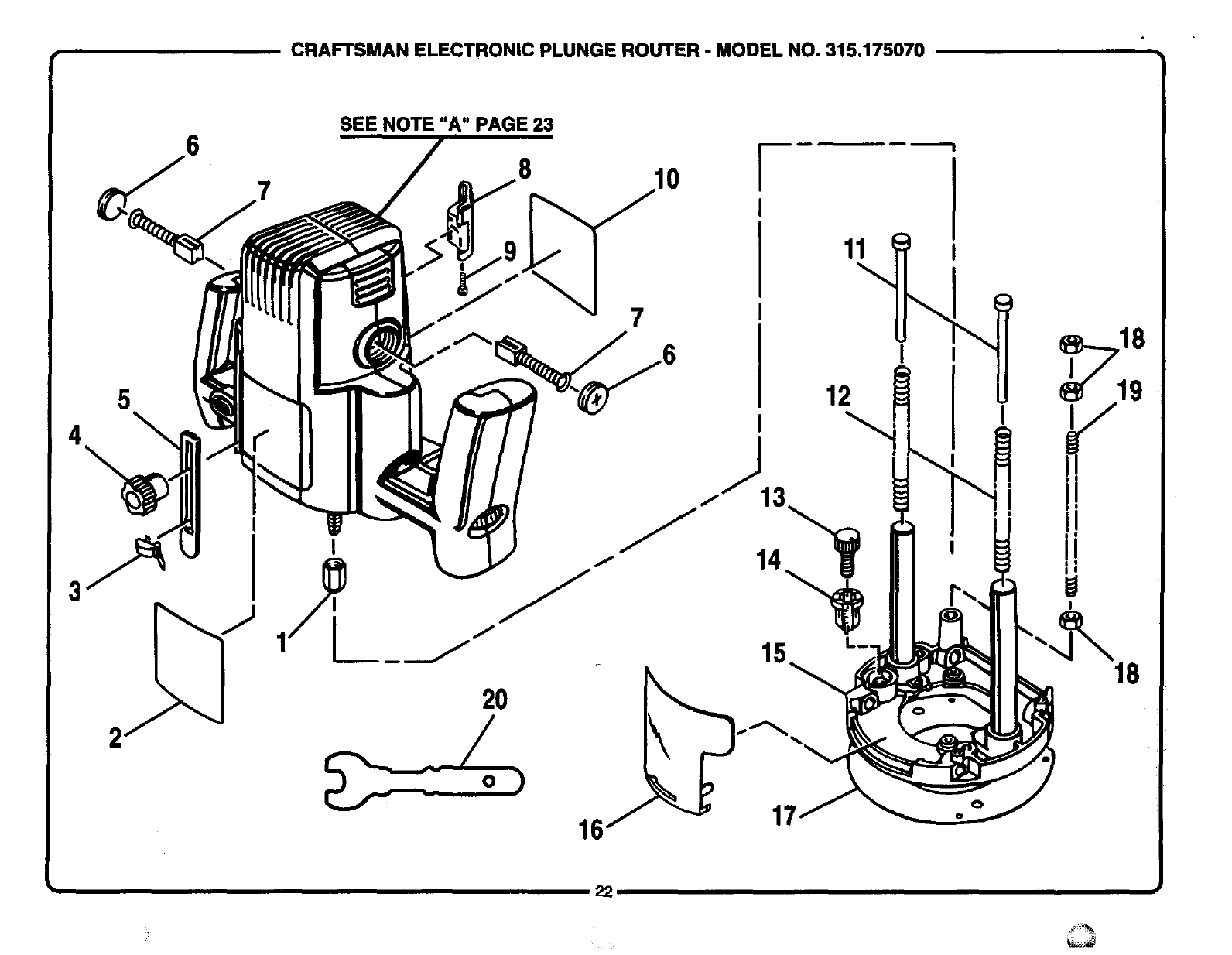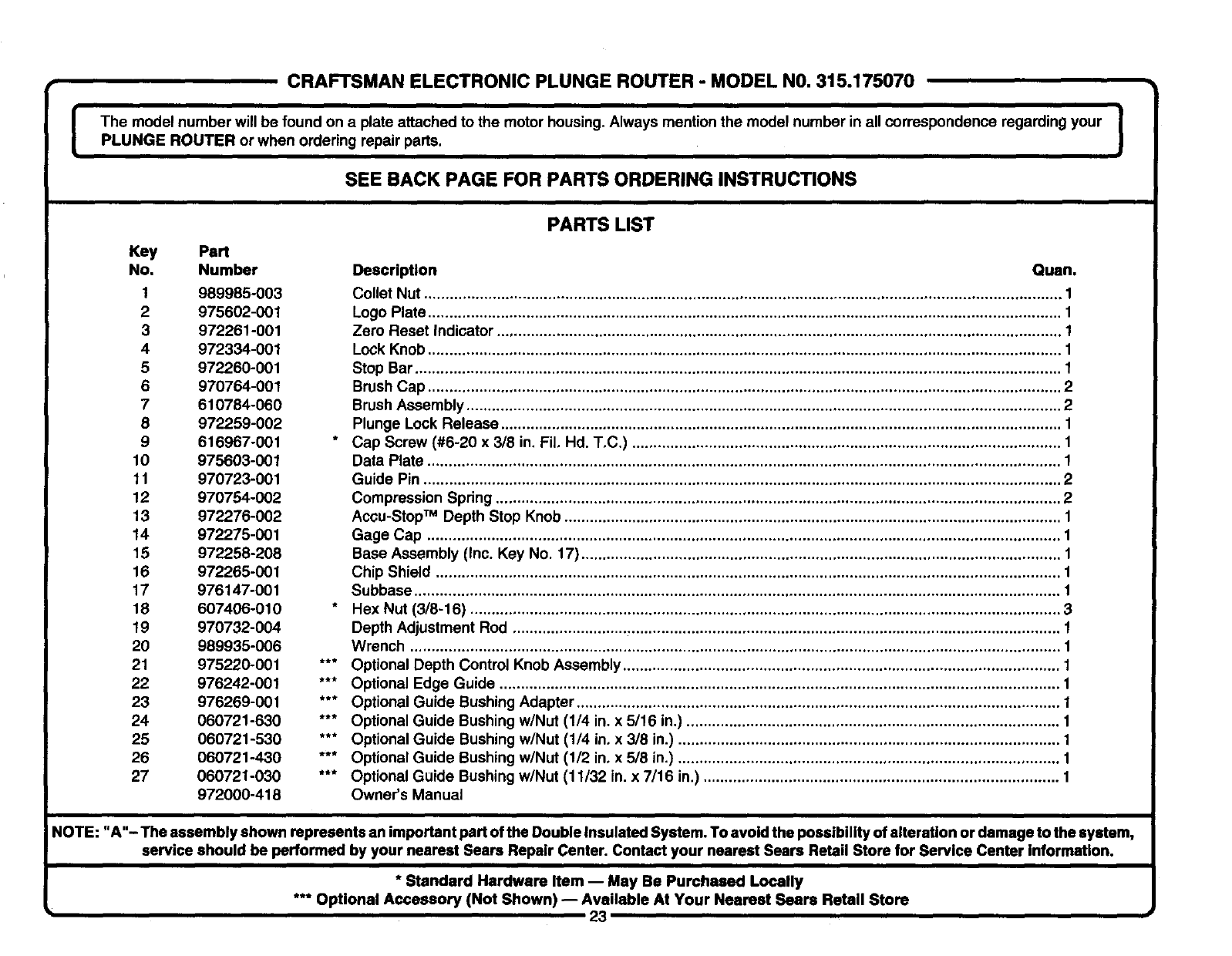 User Manual: Craftsman 315175070 315175070 CRAFTSMAN ELECTRONIC PLUNGE ROUTER - Manuals and Guides View the owners manual for your CRAFTSMAN ELECTRONIC PLUNGE ROUTER #315175070. Home:Tool Parts:Craftsman Parts:Craftsman ELECTRONIC PLUNGE ROUTER Manual