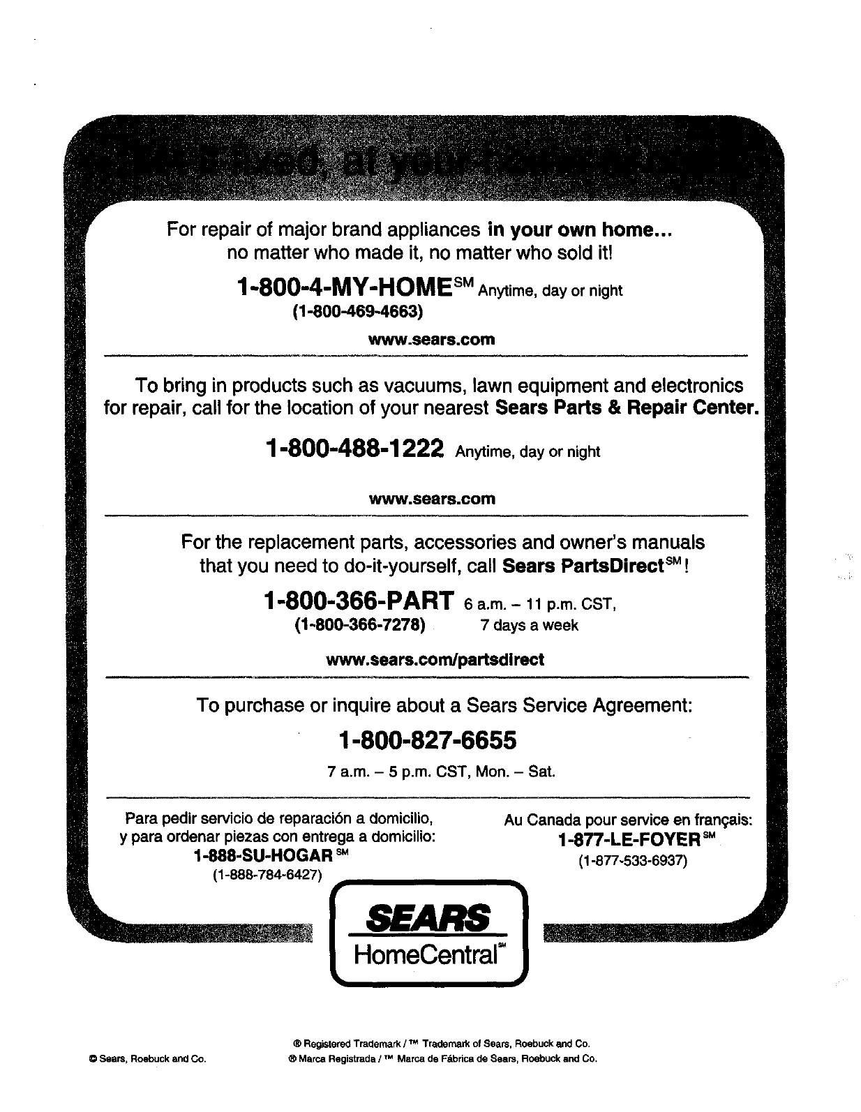 for repair, call for the location of your nearest Sears Parts & Repair Center,
