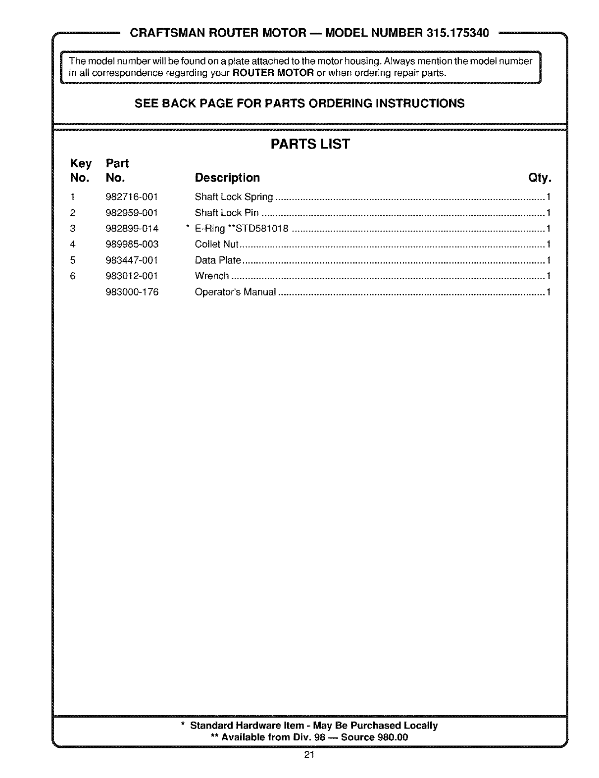User Manual: Craftsman 315175340 315175340 CRAFTSMAN ROUTER - Manuals and Guides View the owners manual for your CRAFTSMAN ROUTER #315175340. Home:Tool Parts:Craftsman Parts:Craftsman ROUTER Manual