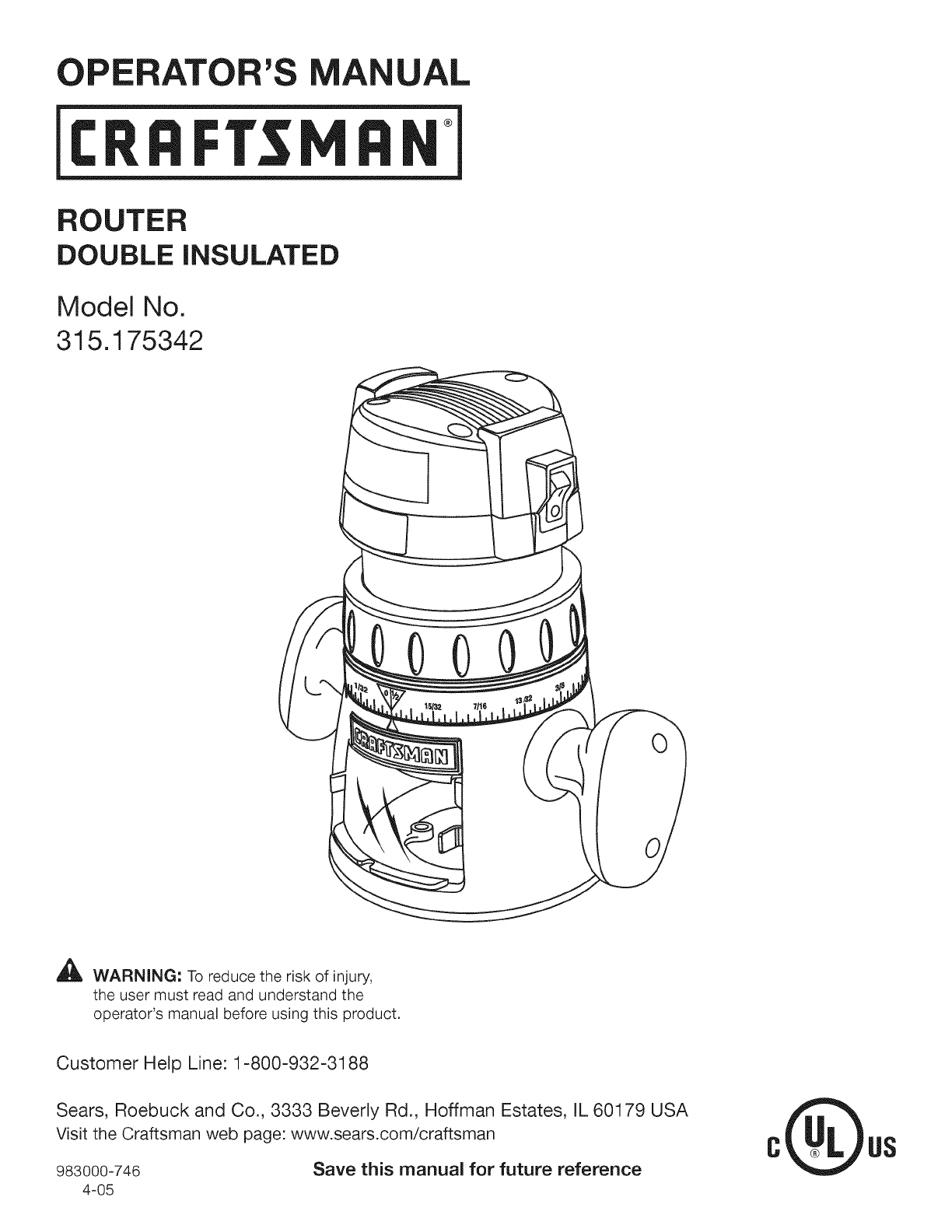User Manual: Craftsman 315175342 315175342 CRAFTSMAN ROUTER - Manuals and Guides View the owners manual for your CRAFTSMAN ROUTER #315175342. Home:Tool Parts:Craftsman Parts:Craftsman ROUTER Manual