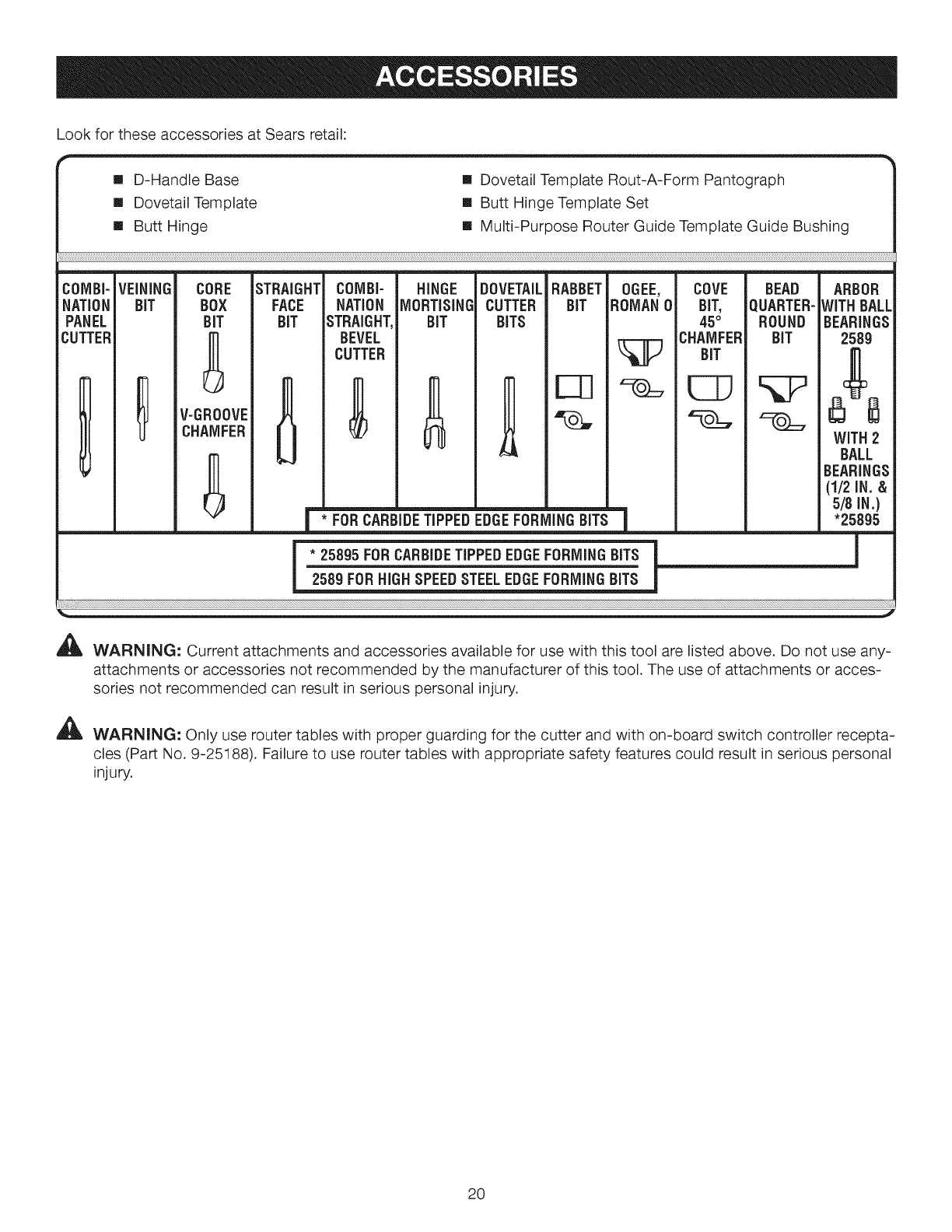 cles (Part No. 9-25188). Failure to use router tables with appropriate safety features could result in serious personal