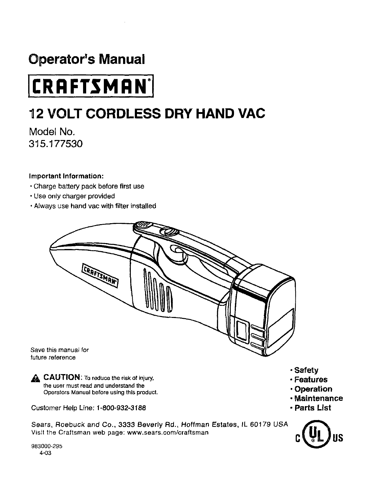 User Manual: Craftsman 315177530 315177530 CRAFTSMAN HAND VAC - Manuals and Guides View the owners manual for your CRAFTSMAN HAND VAC #315177530. Home:Vacuums & Floor Care Parts:Craftsman Parts:Craftsman HAND VAC Manual