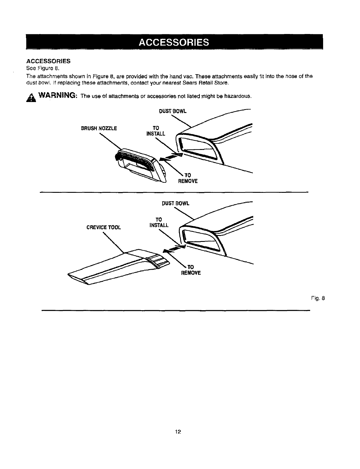 The attachments shown in Figure 8, are provided with the hand vac. These attachments easily fit into the nose of the