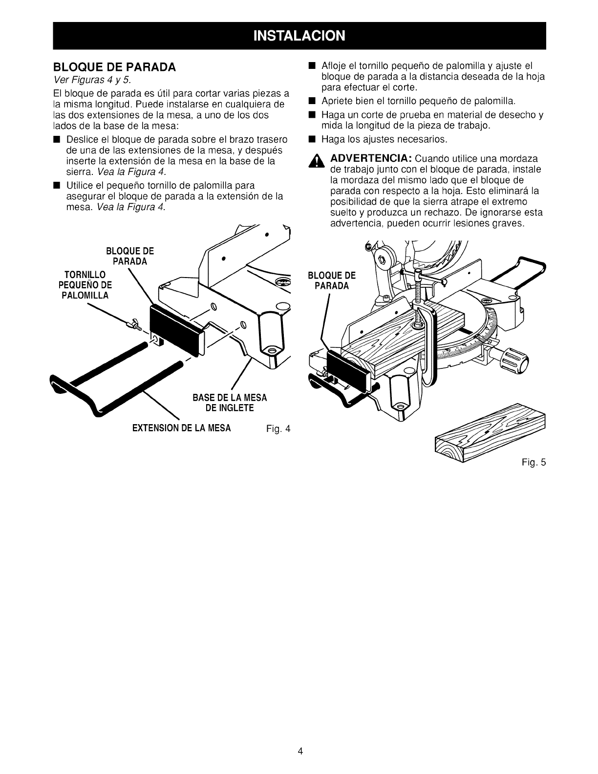 de trabajo junto con el bloque de parada, instale