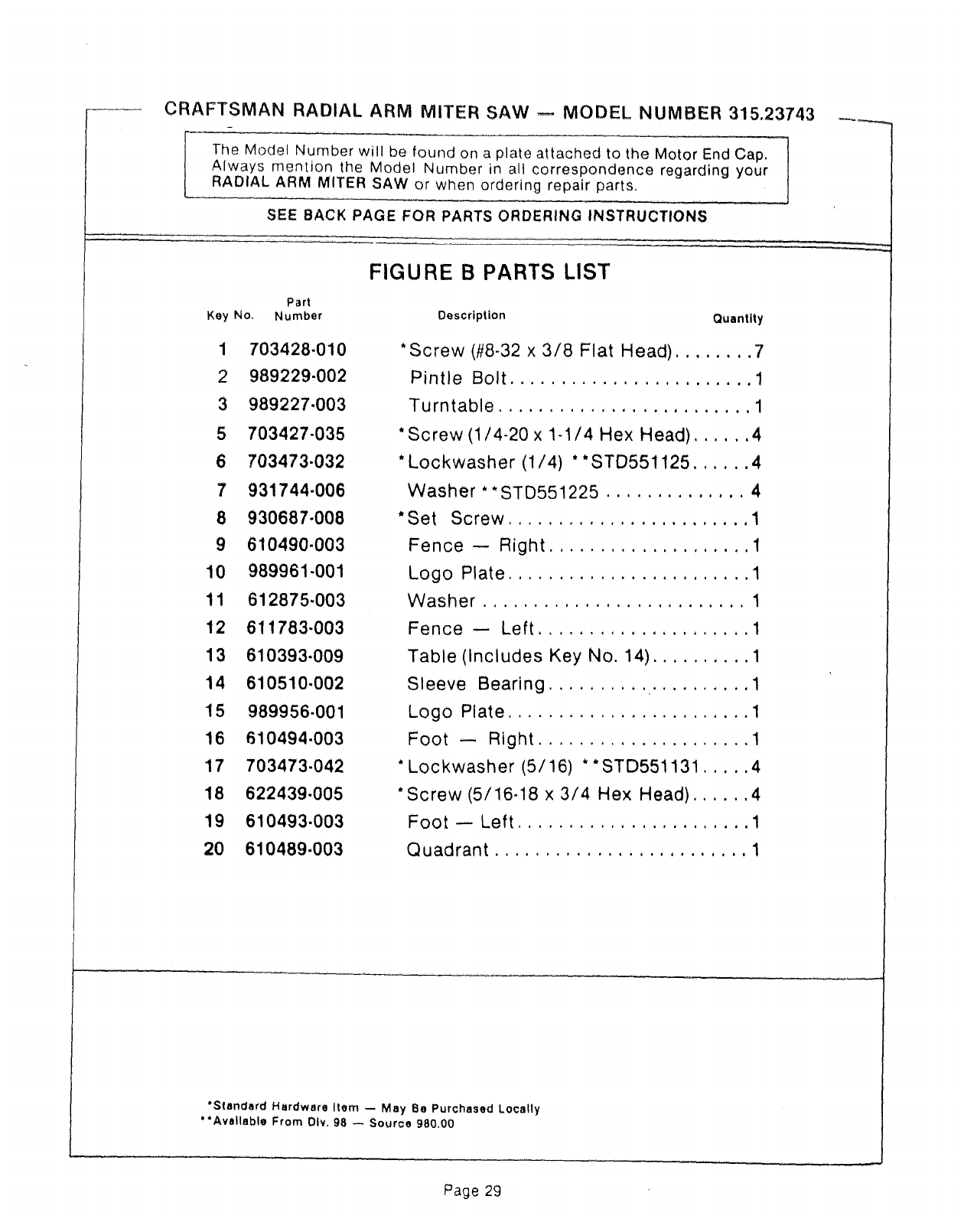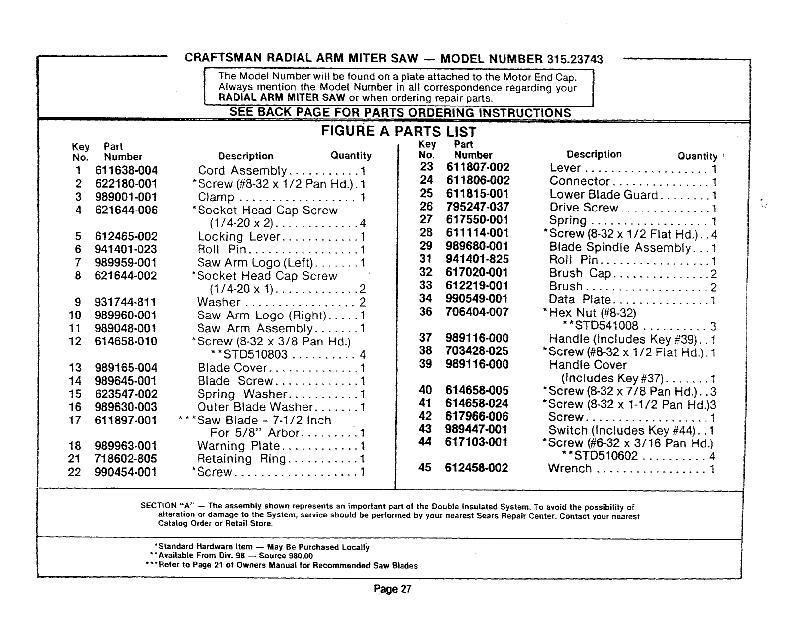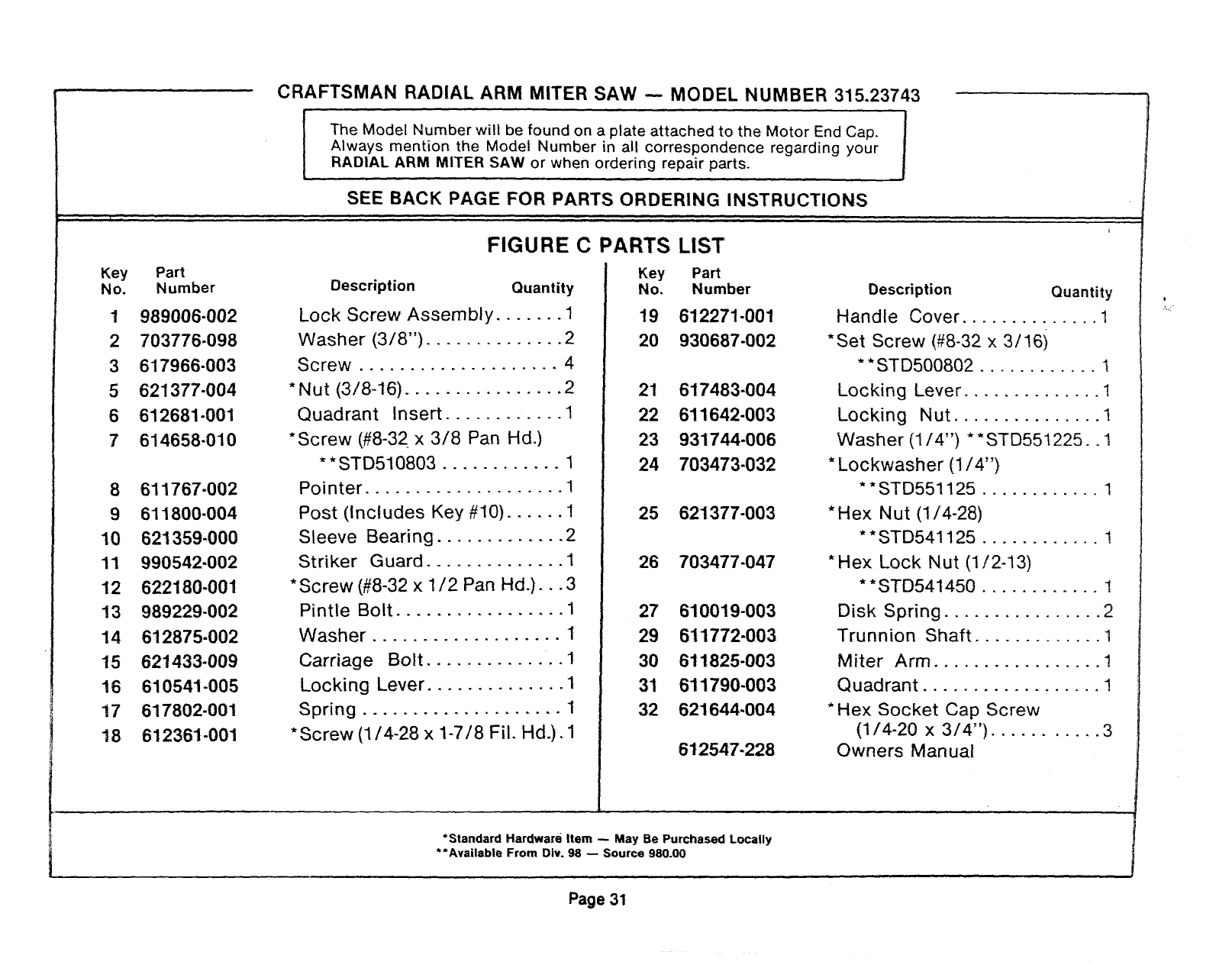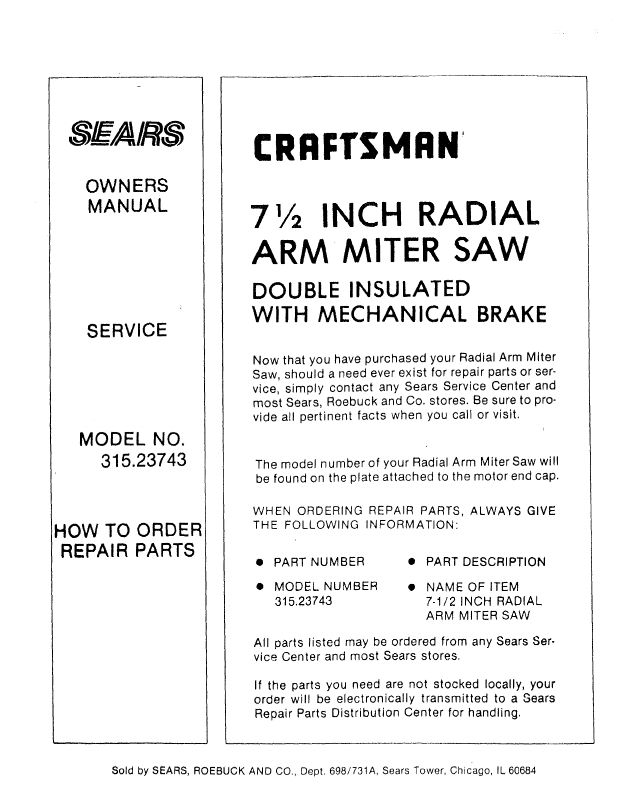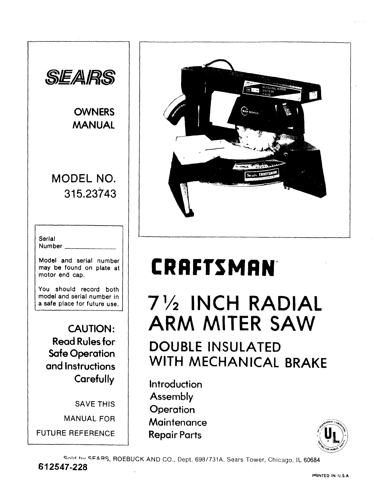 User Manual: Craftsman 31523743 31523743 CRAFTSMAN CRAFTSMAN RADIAL ARM MITER SAW - Manuals and Guides View the owners manual for your CRAFTSMAN CRAFTSMAN RADIAL ARM MITER SAW #31523743. Home:Tool Parts:Craftsman Parts:Craftsman CRAFTSMAN RADIAL ARM MITER SAW Manual