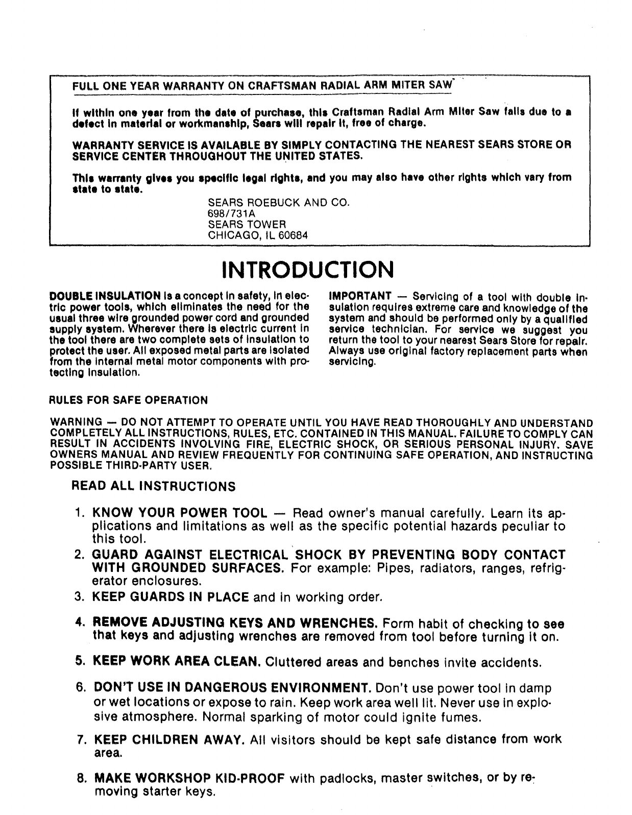 FULL ONE YEAR WARRANTY ON CRAFTSMAN RADIAL ARM MITER SAW"