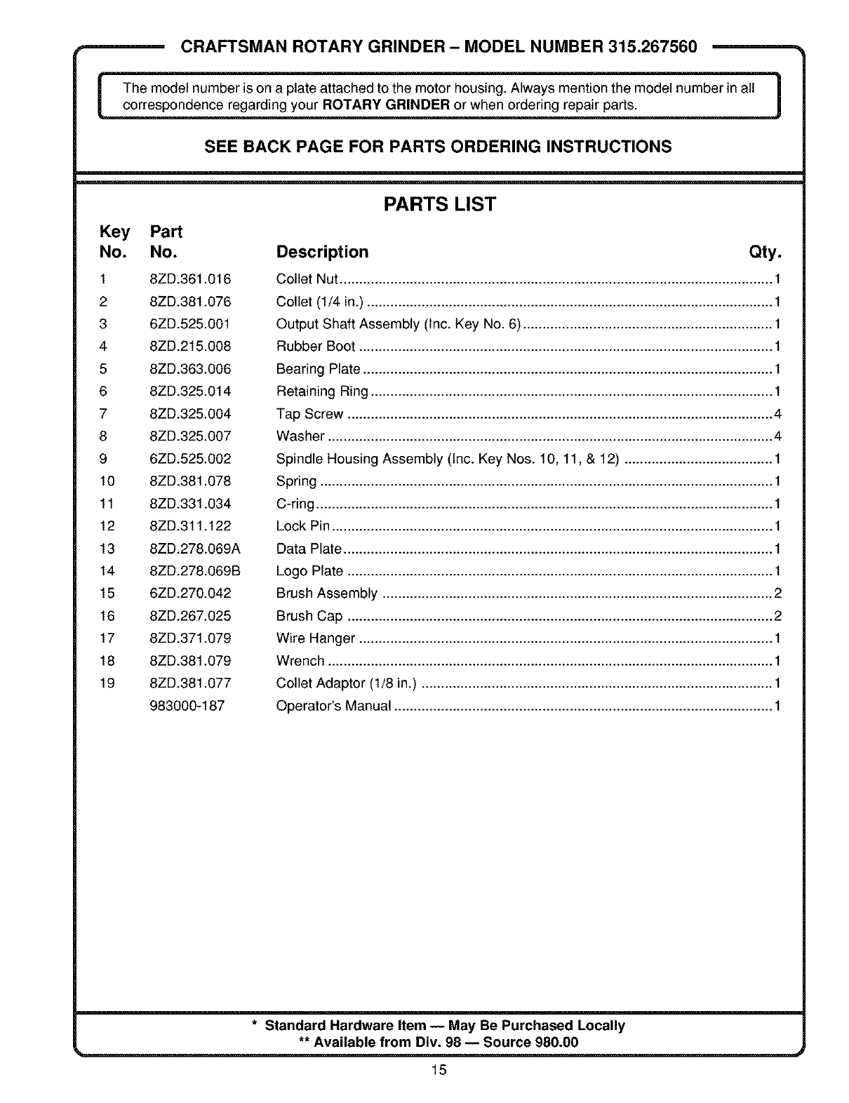 -- CRAFTSMAN ROTARY GRINDER- MODEL NUMBER 315.267560 --