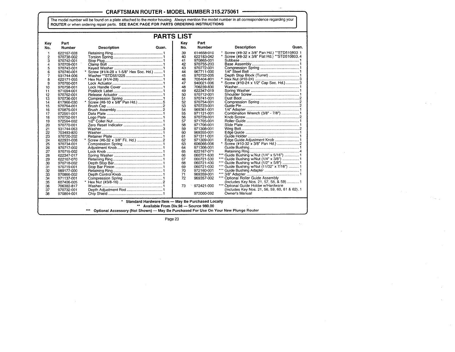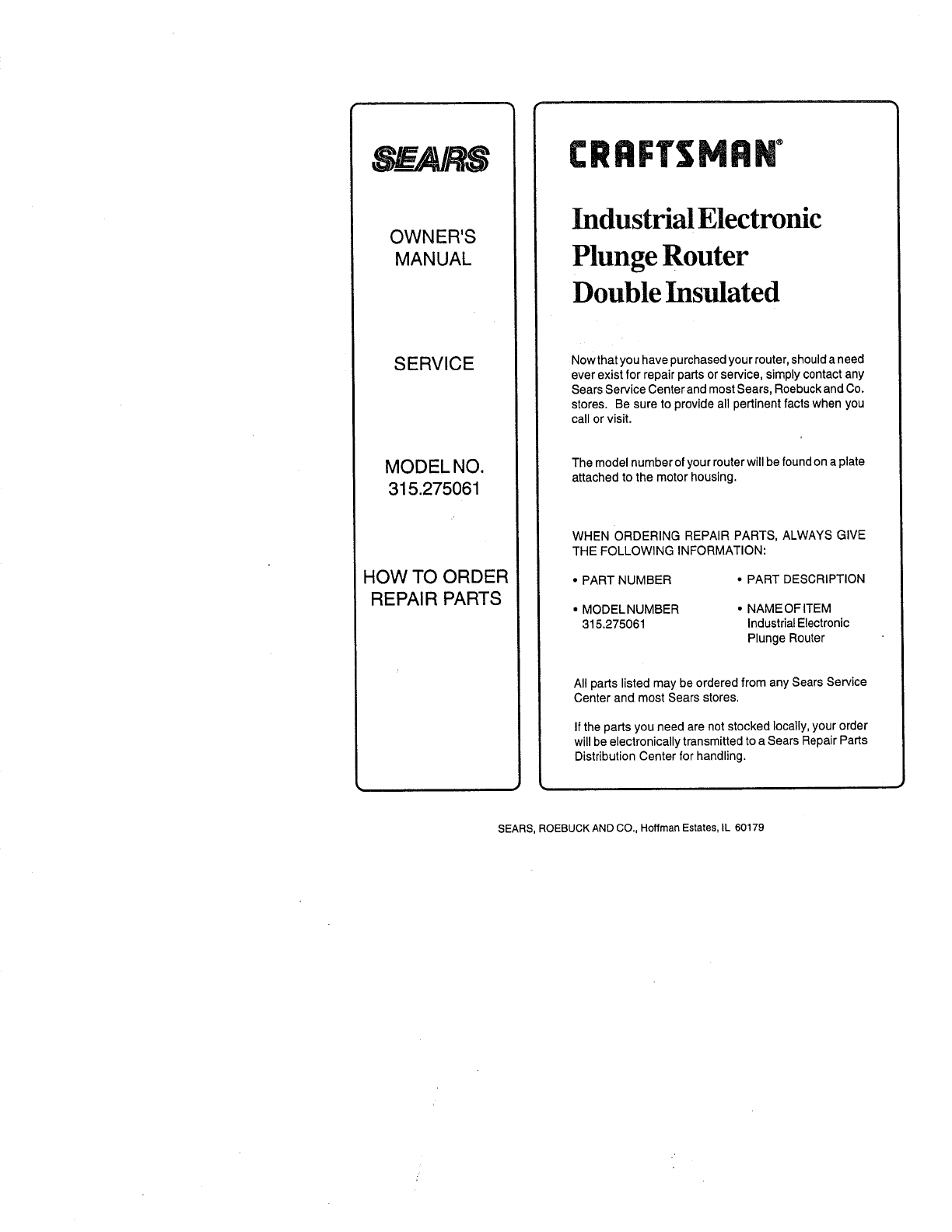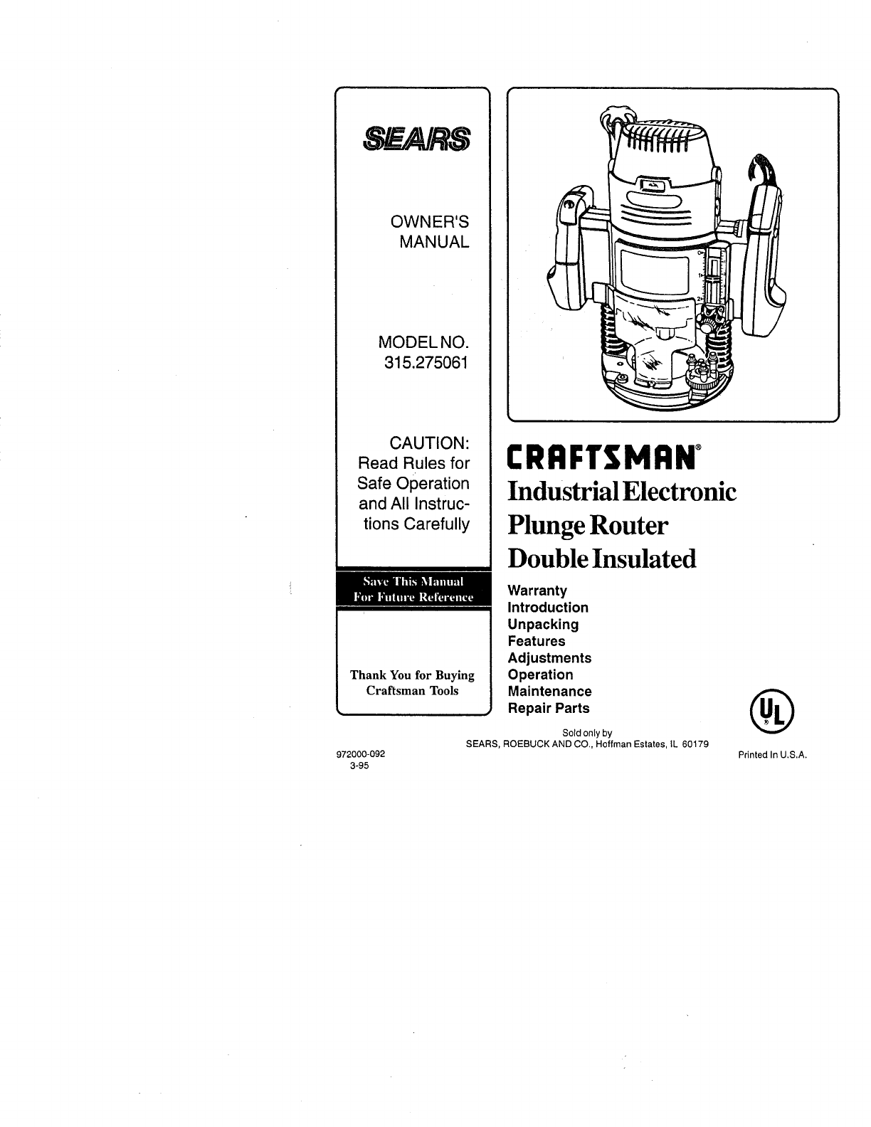 User Manual: Craftsman 315275061 315275061 CRAFTSMAN ROUTER - Manuals and Guides View the owners manual for your CRAFTSMAN ROUTER #315275061. Home:Tool Parts:Craftsman Parts:Craftsman ROUTER Manual