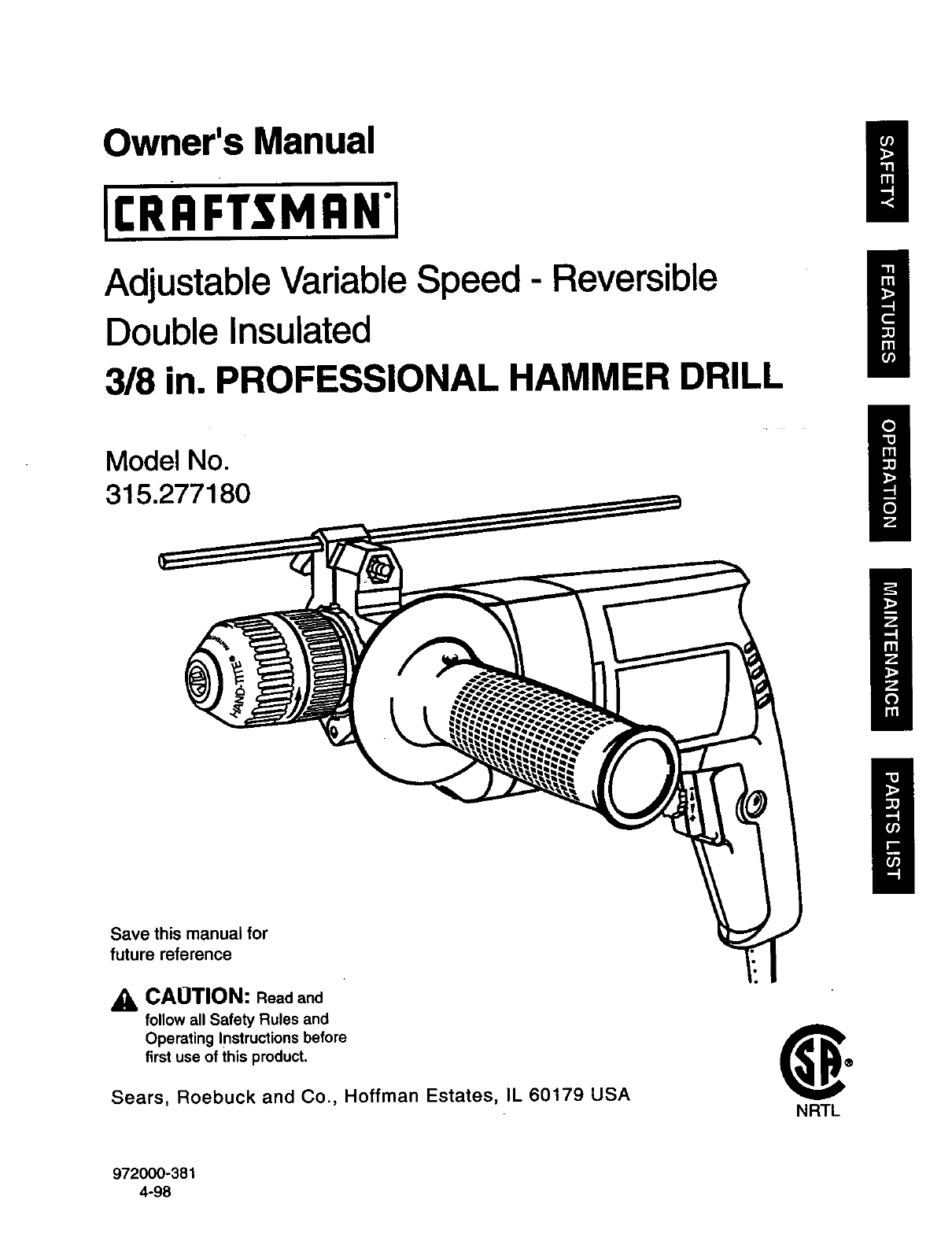 Craftsman 315277180 User Manual PROFESSIONAL HAMMER DRILL Manuals And Guides 98110178
