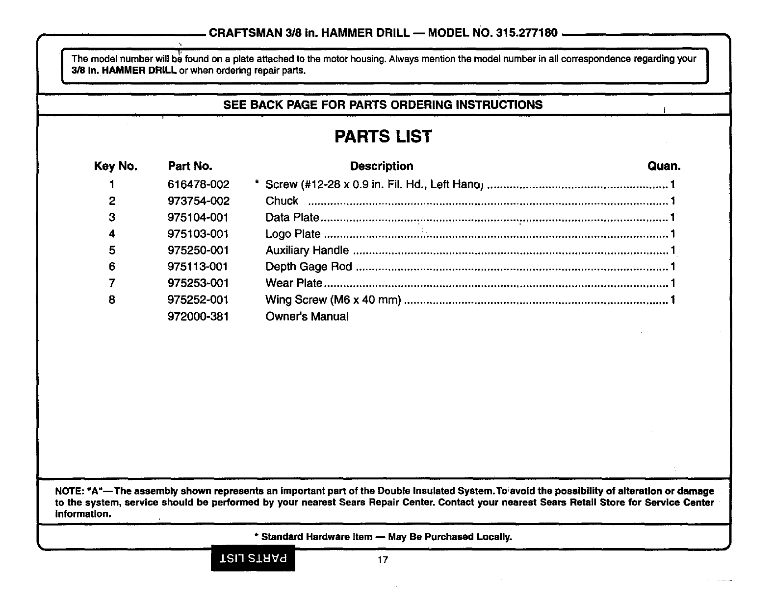 SEE BACK PAGE FOR PARTS ORDERING INSTRUCTIONS