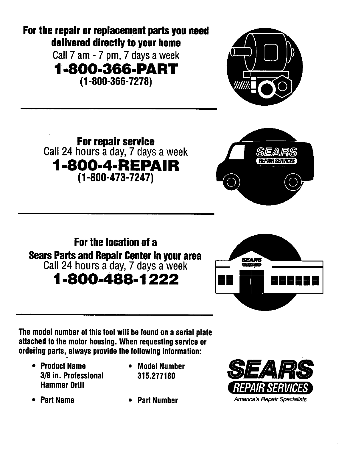 3/8 in. HAMMER DRILL or when ordering repair parts.