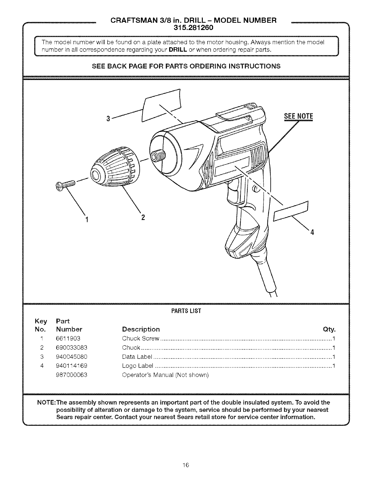 User Manual: Craftsman 315281260 315281260 CRAFTSMAN REAR HANDLE DRILL - Manuals and Guides View the owners manual for your CRAFTSMAN REAR HANDLE DRILL #315281260. Home:Tool Parts:Craftsman Parts:Craftsman REAR HANDLE DRILL Manual