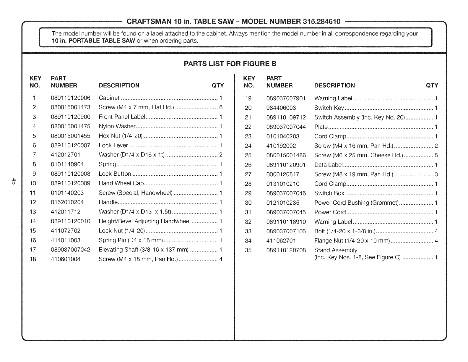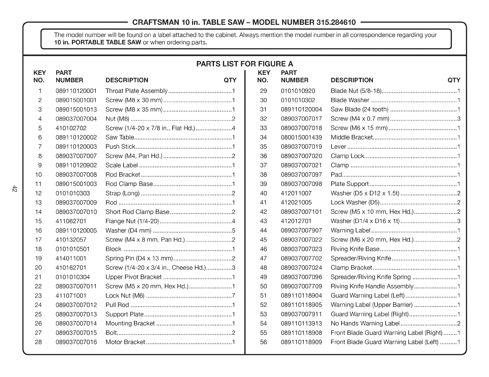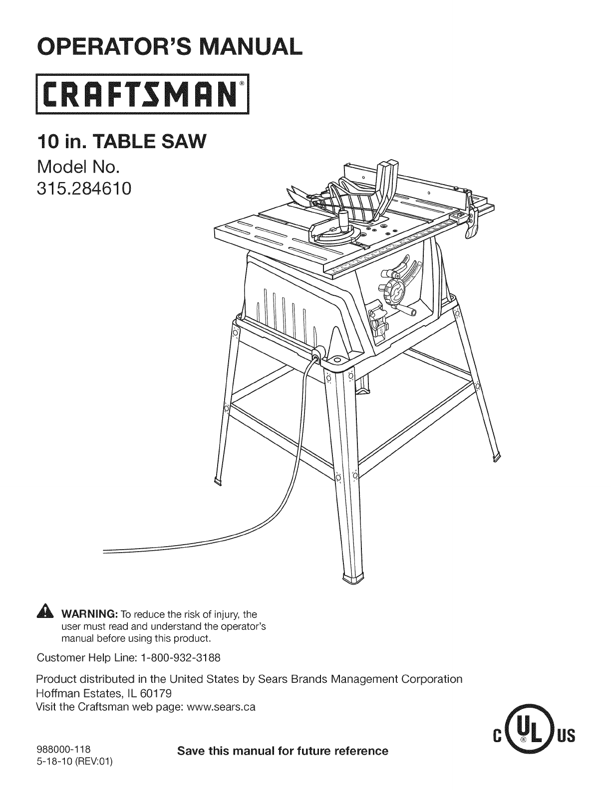 User Manual: Craftsman 315284610 315284610 CRAFTSMAN 10 TABLE SAW - Manuals and Guides View the owners manual for your CRAFTSMAN 10 TABLE SAW #315284610. Home:Tool Parts:Craftsman Parts:Craftsman 10 TABLE SAW Manual