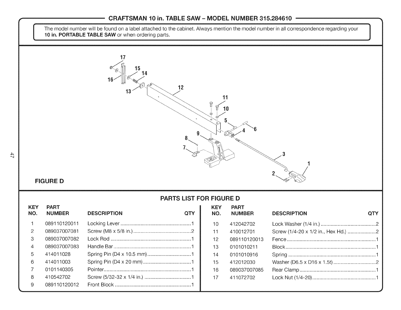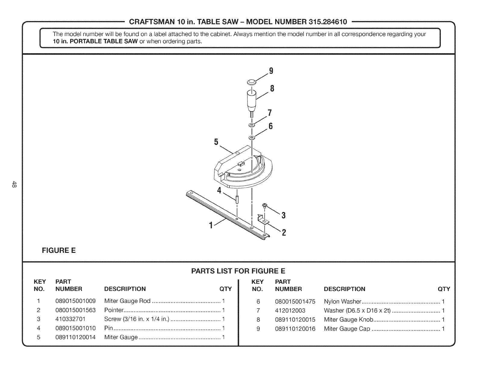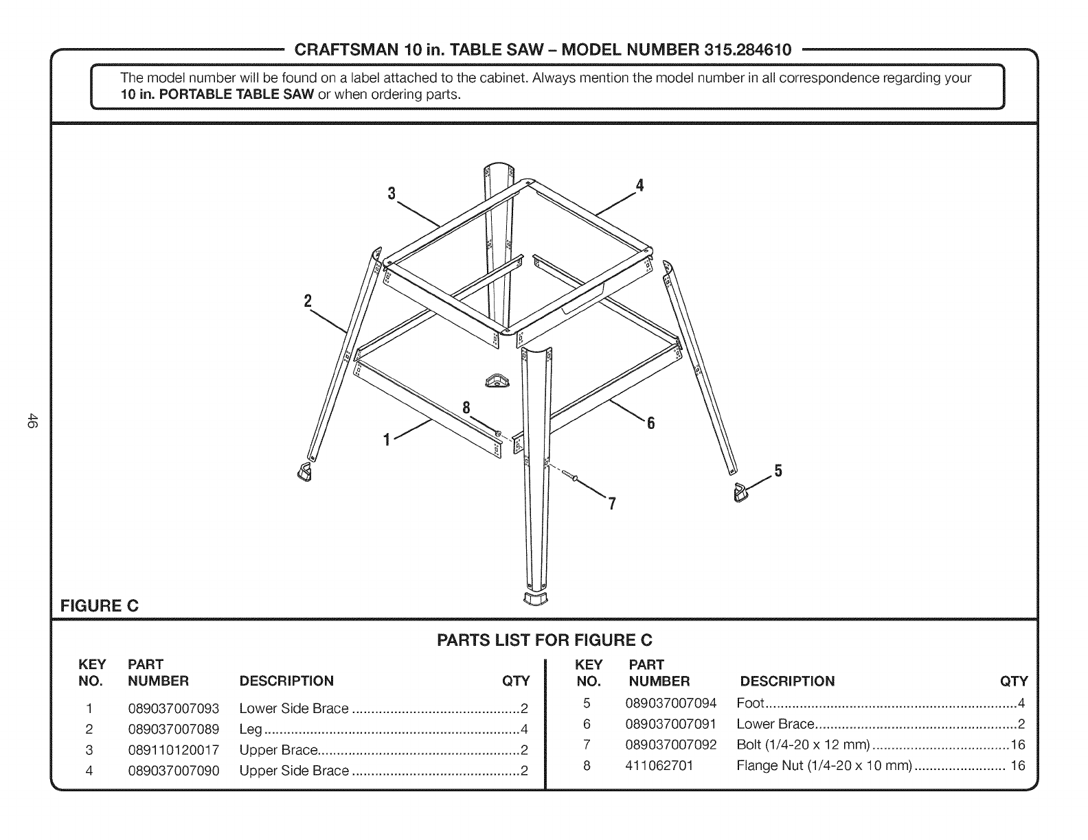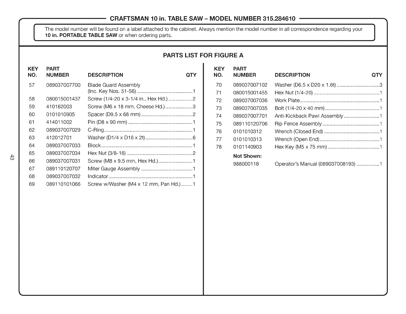 User Manual: Craftsman 315284610 315284610 CRAFTSMAN 10 TABLE SAW - Manuals and Guides View the owners manual for your CRAFTSMAN 10 TABLE SAW #315284610. Home:Tool Parts:Craftsman Parts:Craftsman 10 TABLE SAW Manual