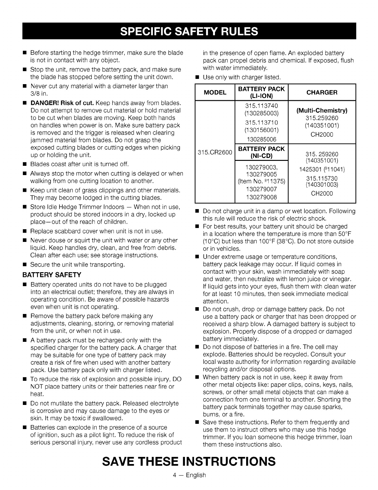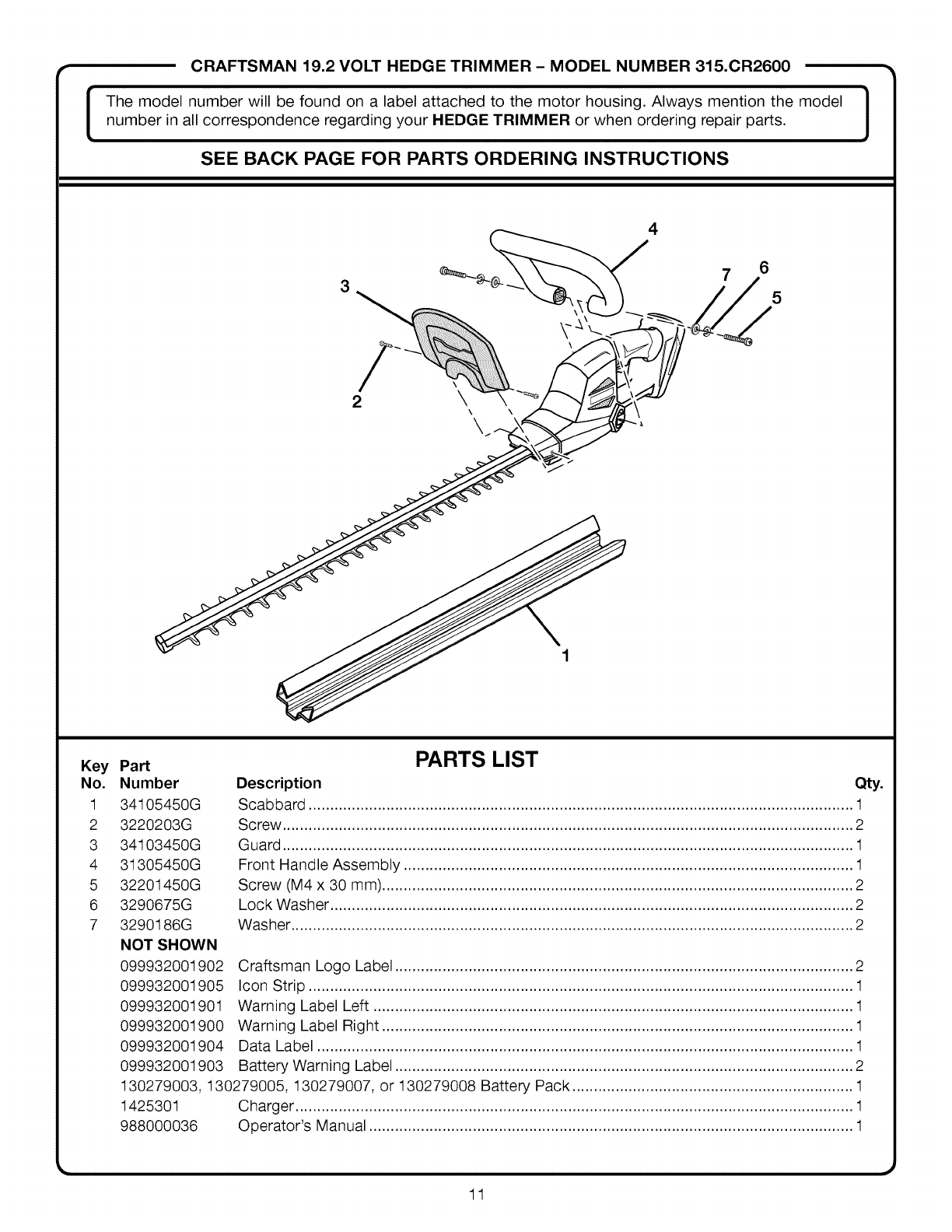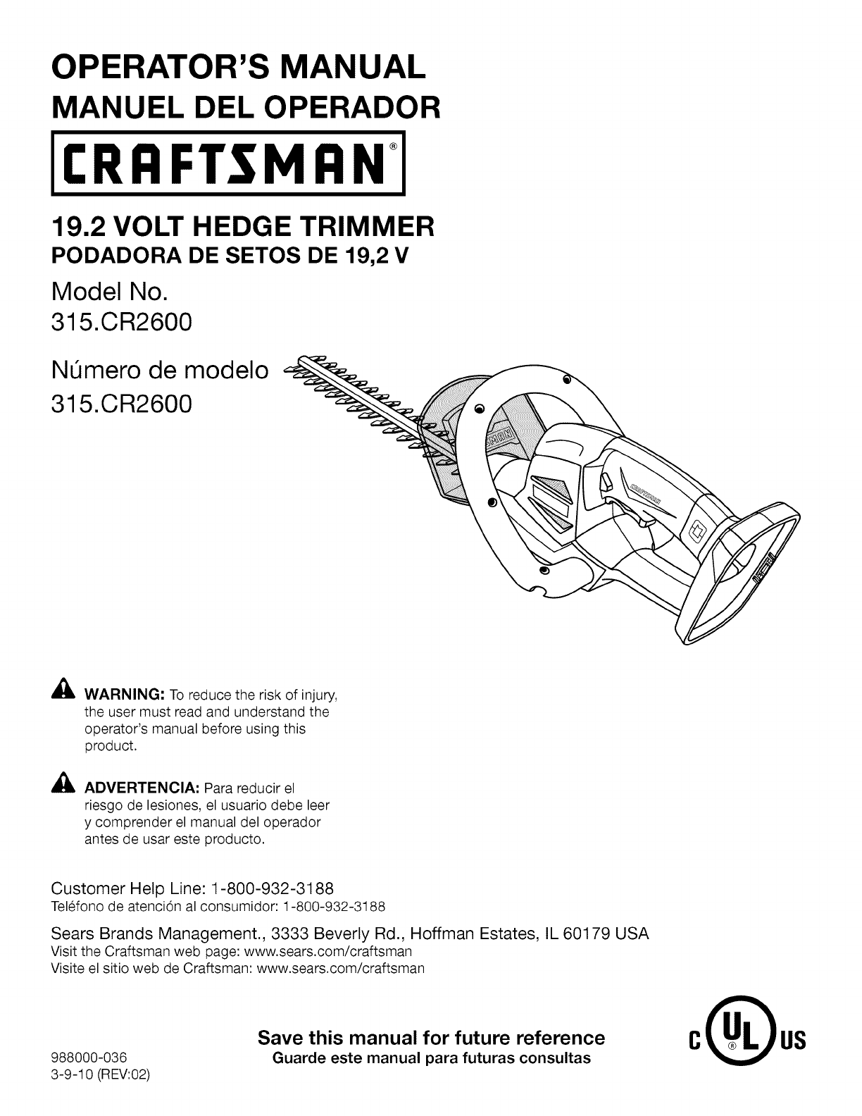 User Manual: Craftsman 315CR2600 315CR2600 CRAFTSMAN HEDGE TRIMMER - Manuals and Guides View the owners manual for your CRAFTSMAN HEDGE TRIMMER #315CR2600. Home:Lawn & Garden Parts:Craftsman Parts:Craftsman HEDGE TRIMMER Manual