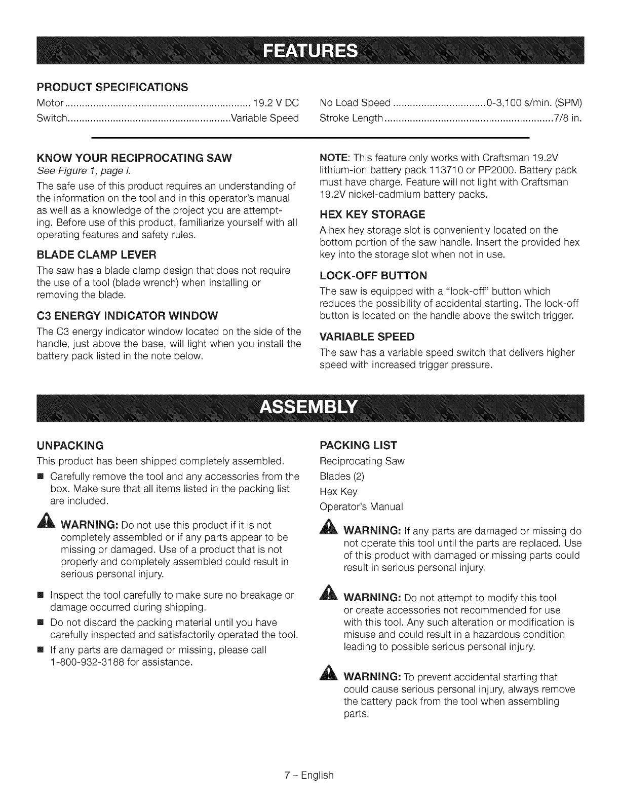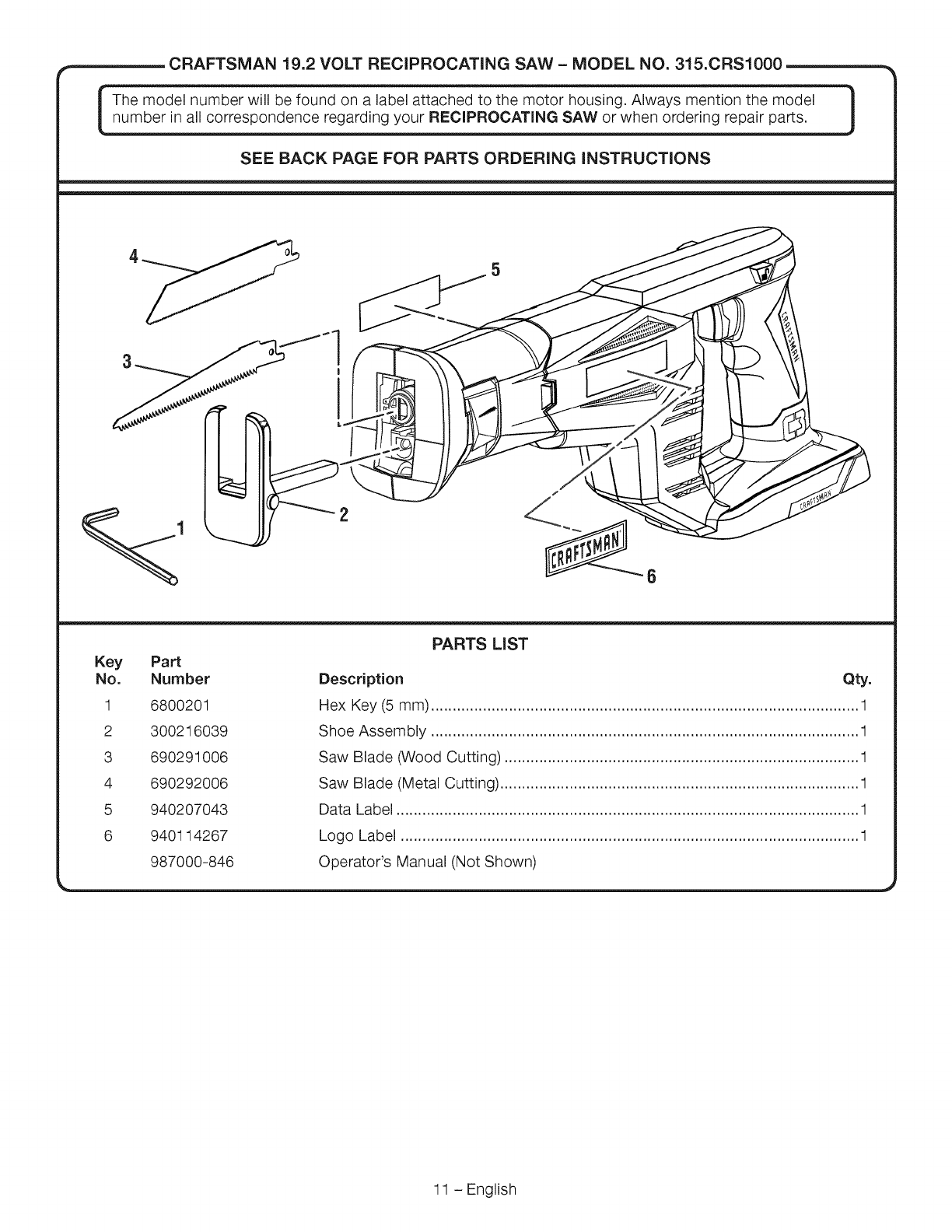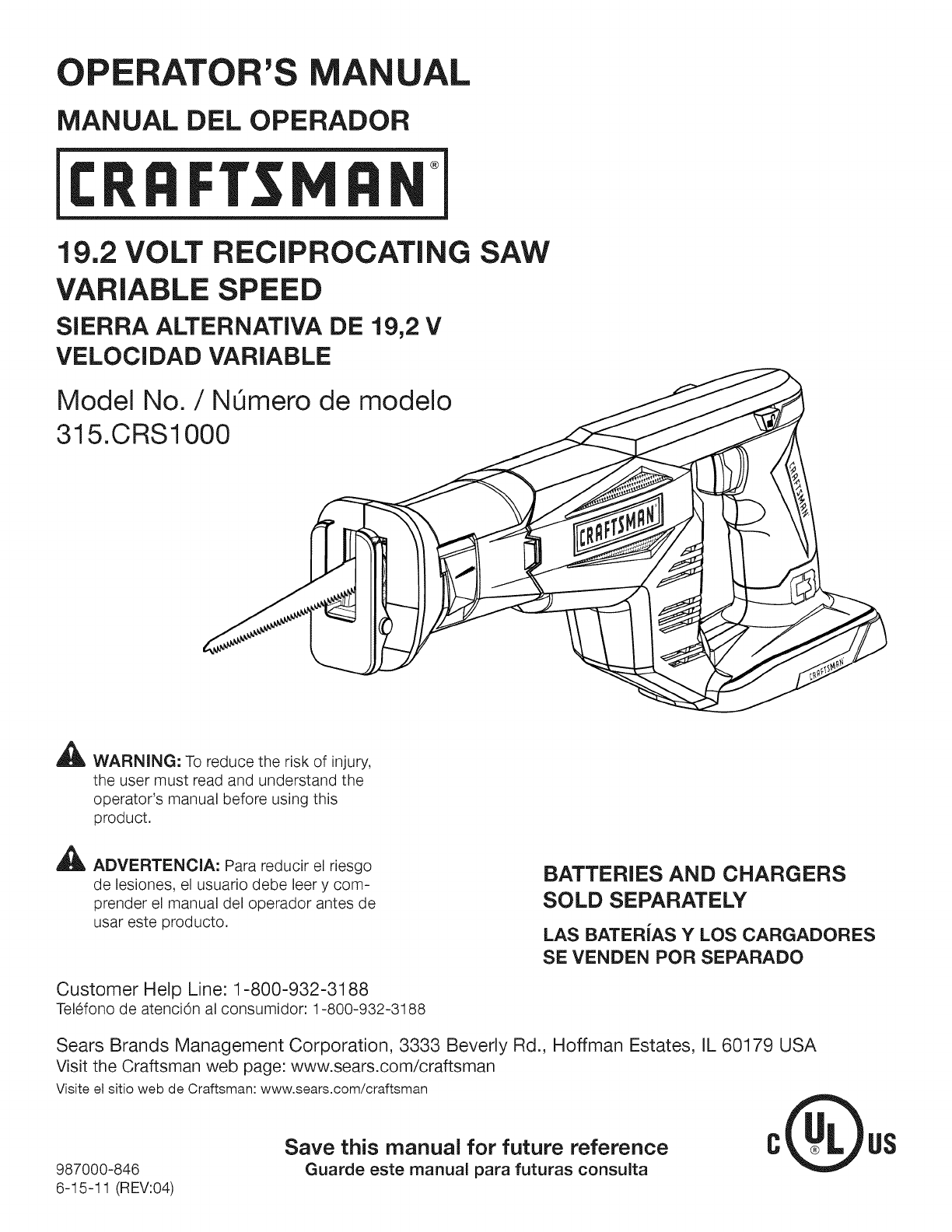 User Manual: Craftsman 315CRS1000 315CRS1000 CRAFTSMAN RECIPROCATING SAW - Manuals and Guides View the owners manual for your CRAFTSMAN RECIPROCATING SAW #315CRS1000. Home:Tool Parts:Craftsman Parts:Craftsman RECIPROCATING SAW Manual