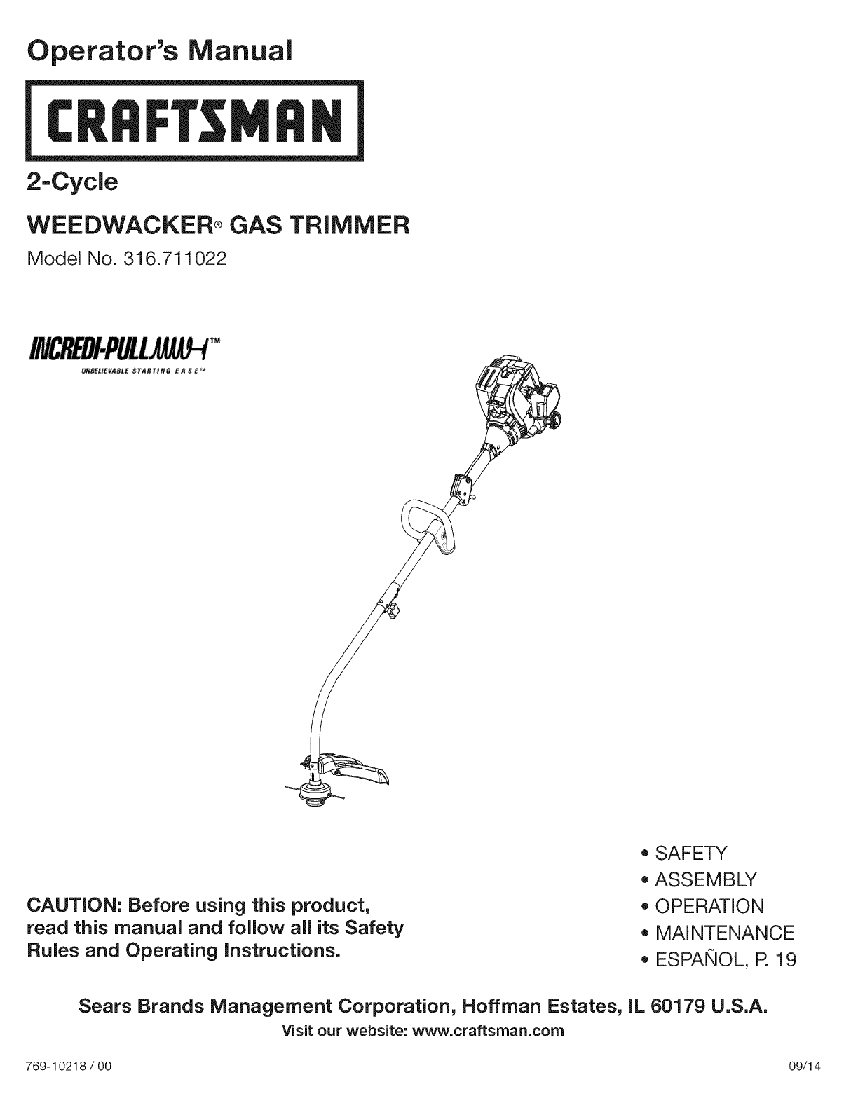 User Manual: Craftsman 316711022 316711022 CRAFTSMAN TRIMMER - Manuals and Guides View the owners manual for your CRAFTSMAN TRIMMER #316711022. Home:Lawn & Garden Parts:Craftsman Parts:316711022 Craftsman Grass trimmer (weed wacker) Manual