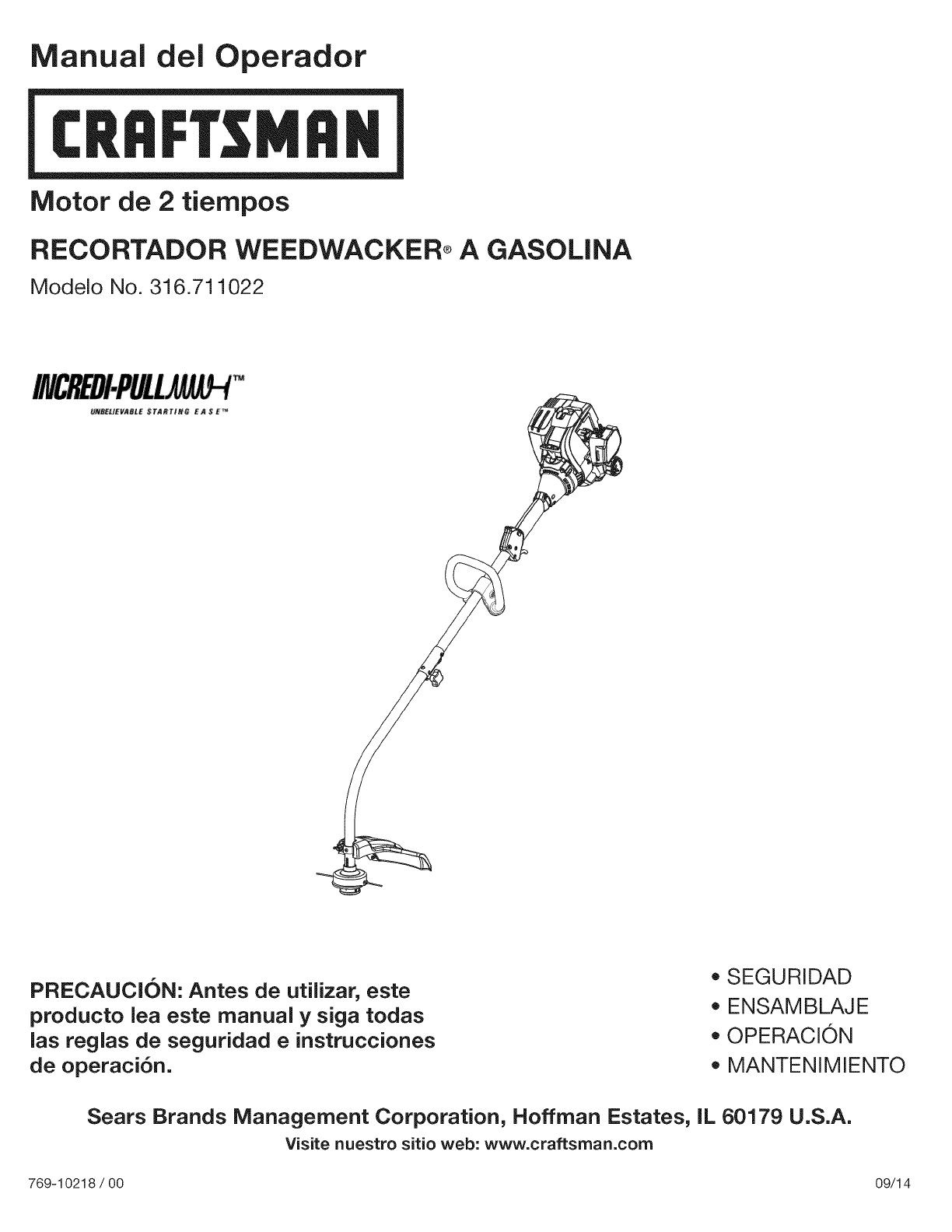 Felicitaciones pot haber hecho una compra inteligente. Su nuevo producto Craftsman® fue disedado y fabricado con vistas a una operaci6n