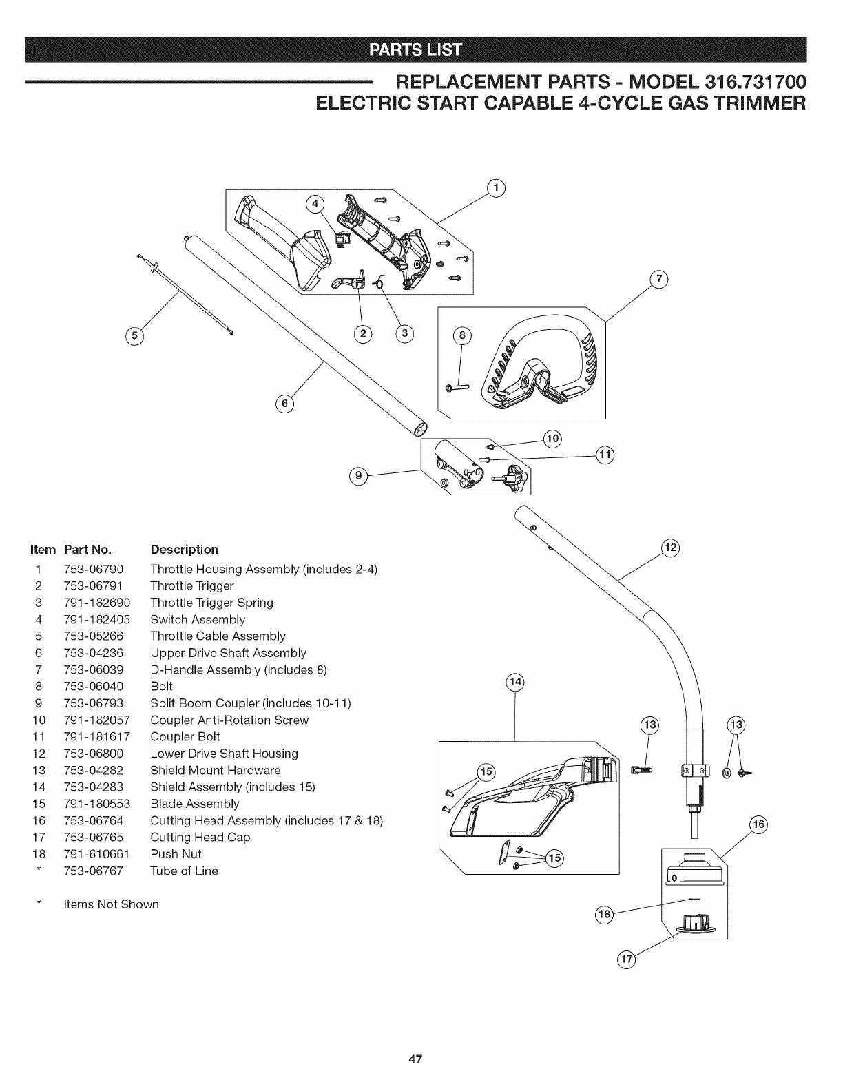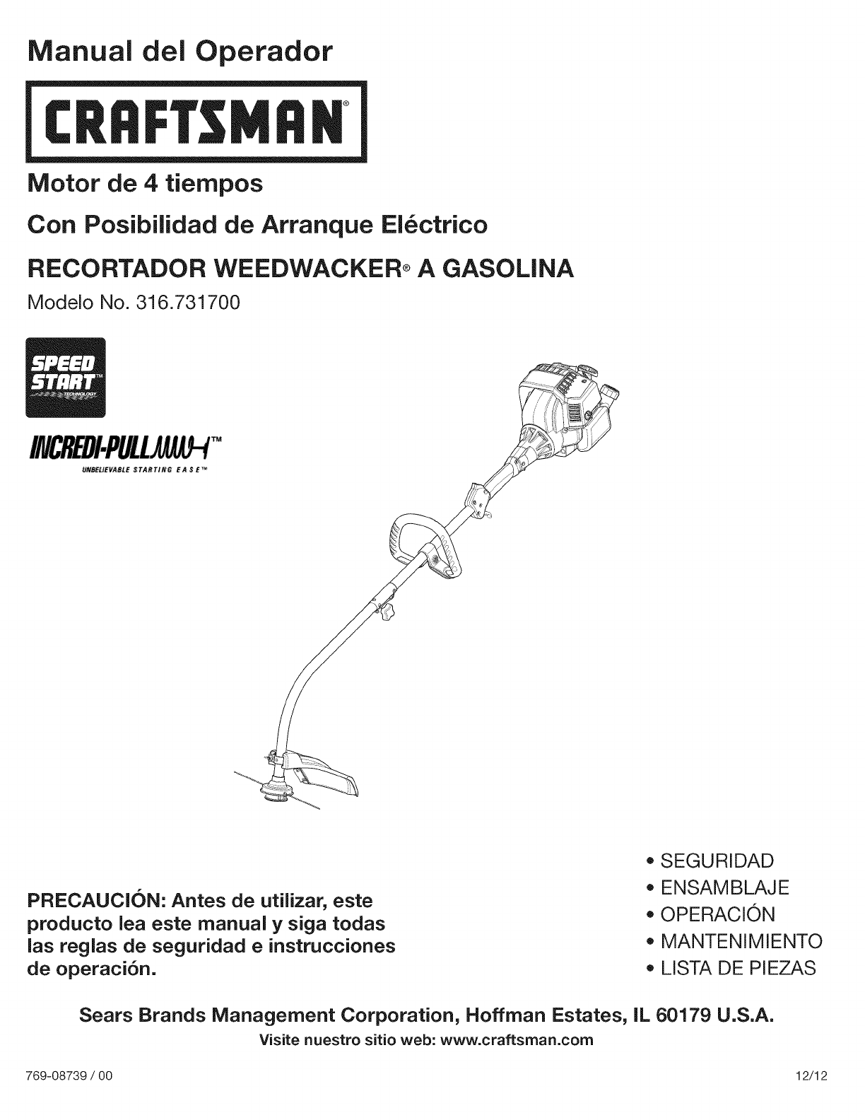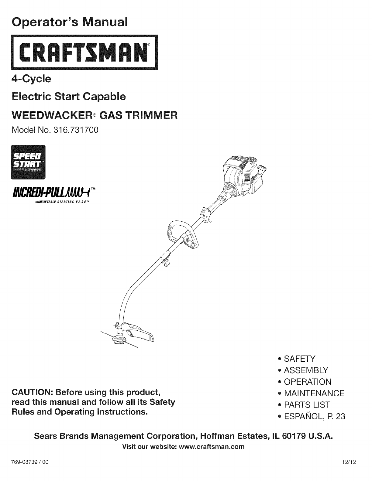 User Manual: Craftsman 316731700 316731700 CRAFTSMAN GAS TRIMMER - Manuals and Guides View the owners manual for your CRAFTSMAN GAS TRIMMER #316731700. Home:Lawn & Garden Parts:Craftsman Parts:316731700 Craftsman Grass trimmer (weed wacker) Manual