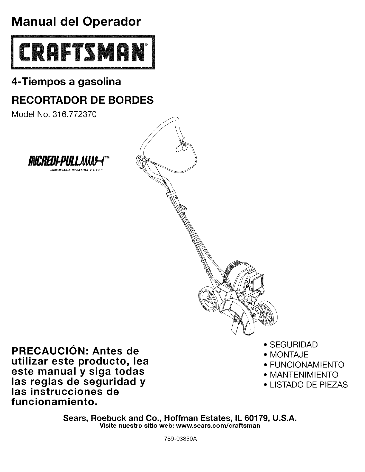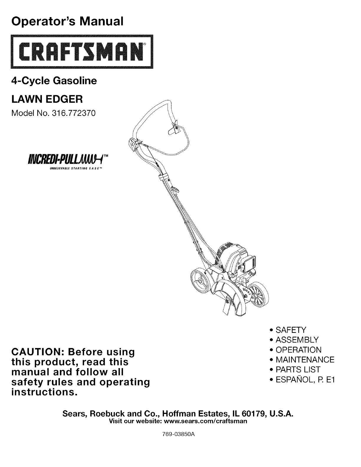 User Manual: Craftsman 316772370 316772370 CRAFTSMAN LAWN EDGER - Manuals and Guides View the owners manual for your CRAFTSMAN LAWN EDGER #316772370. Home:Lawn & Garden Parts:Craftsman Parts:Craftsman LAWN EDGER Manual
