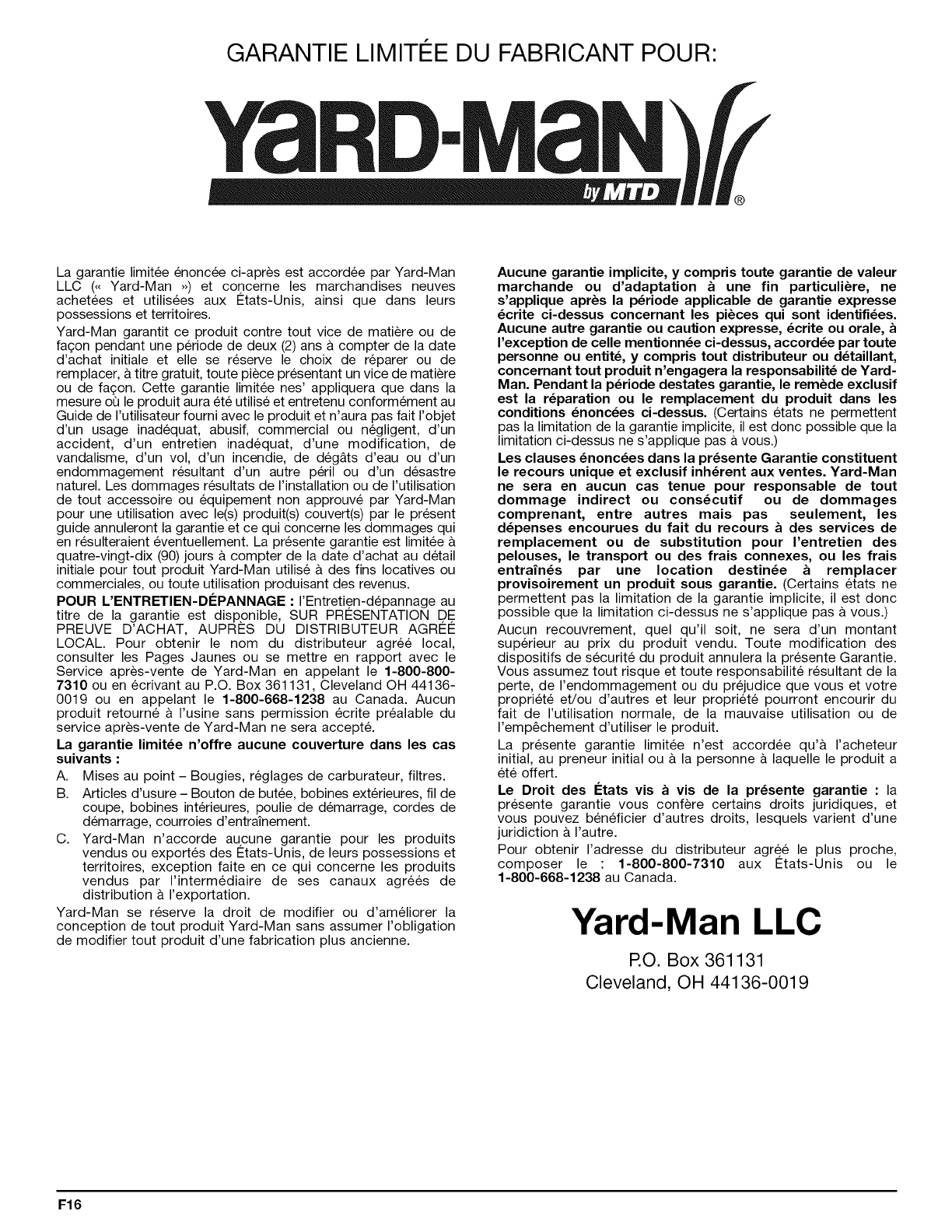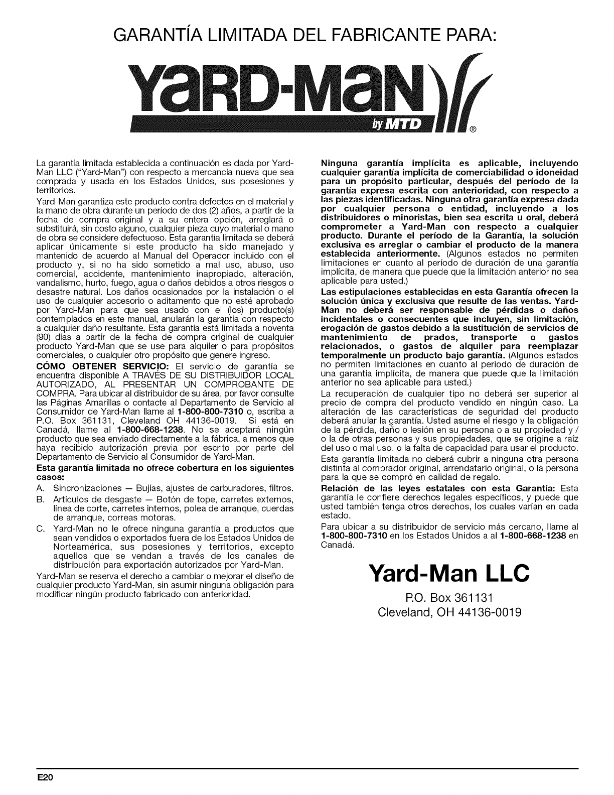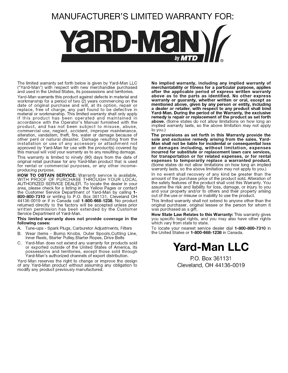 Consumidor de Yard-Man Ilame al 1-800-800-7310 o, escriba a
