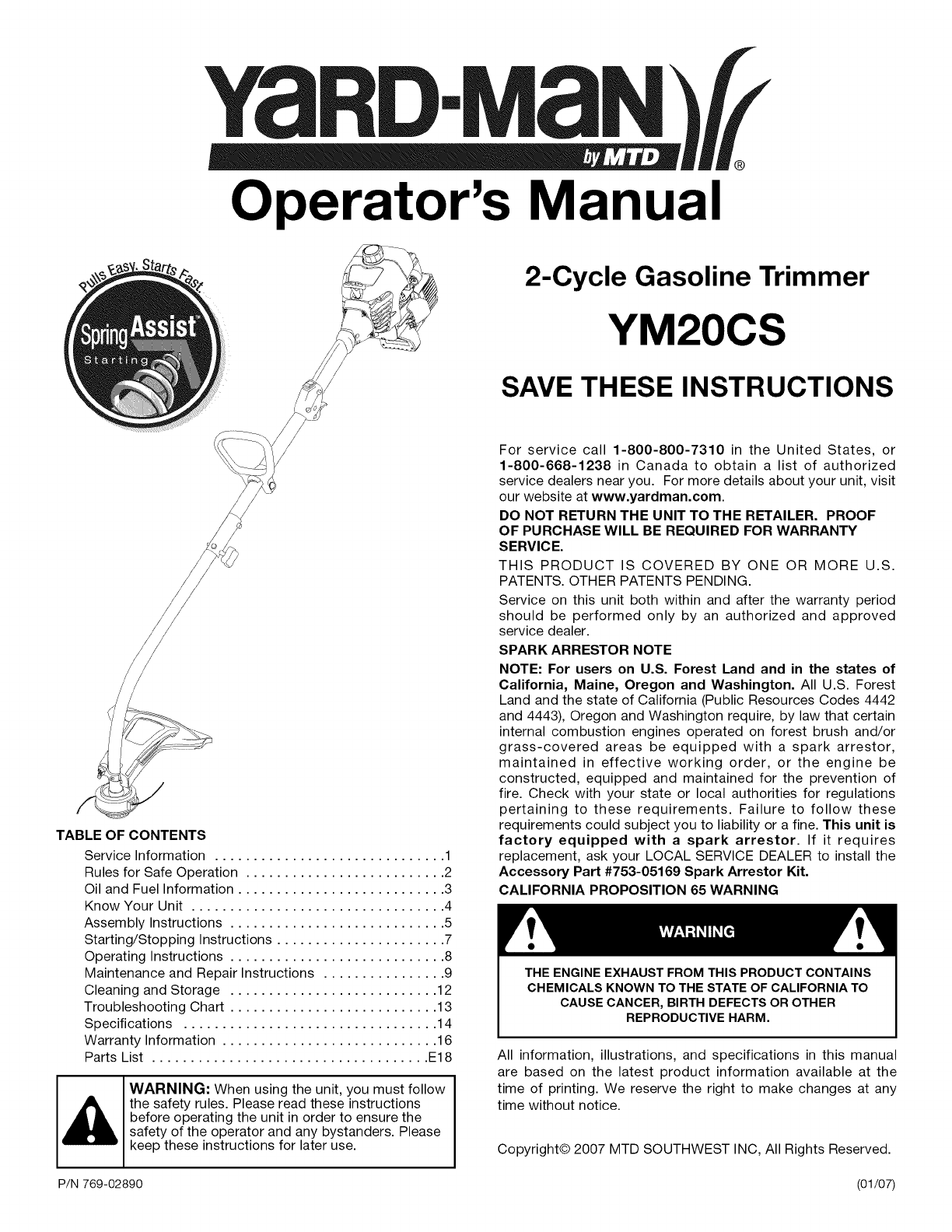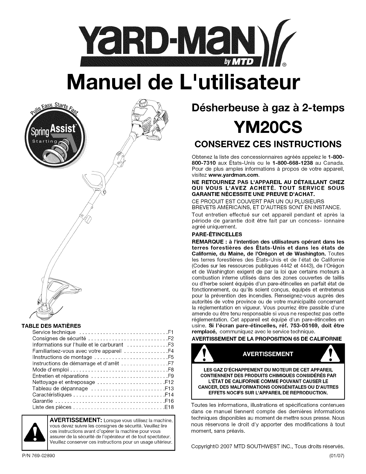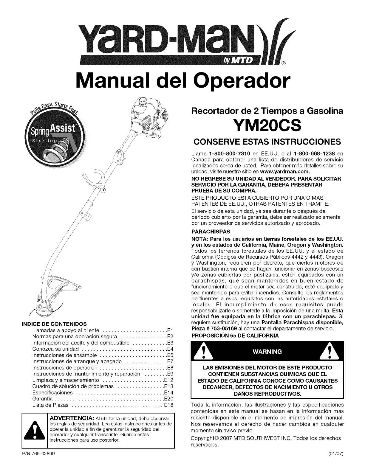 Consumidor de Yard-Man Ilame al 1-800-800-7310 o, escriba a