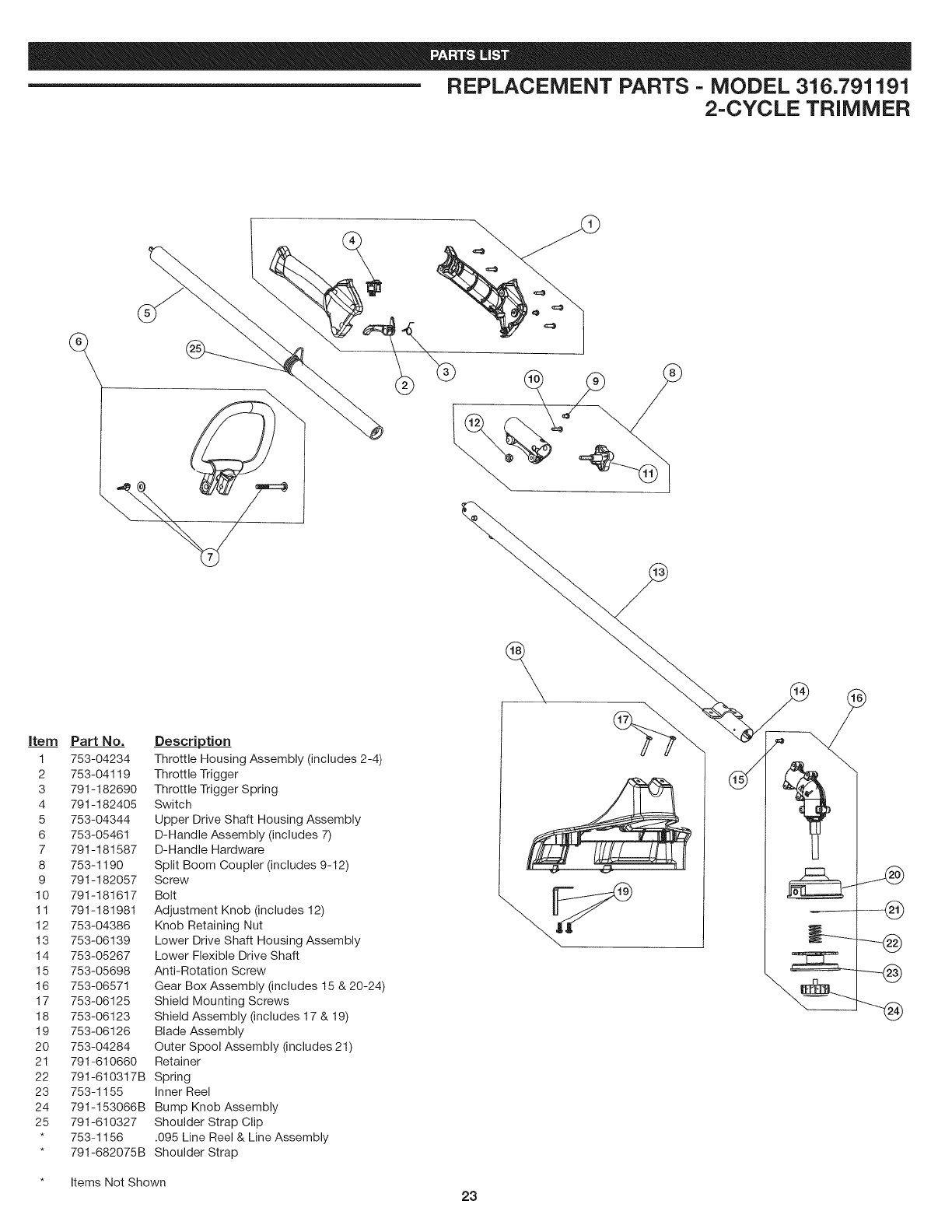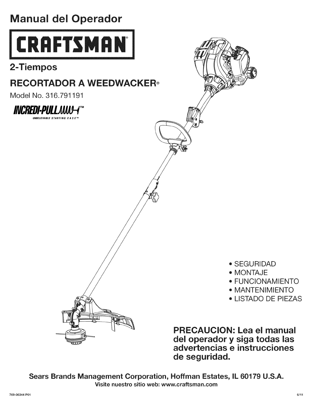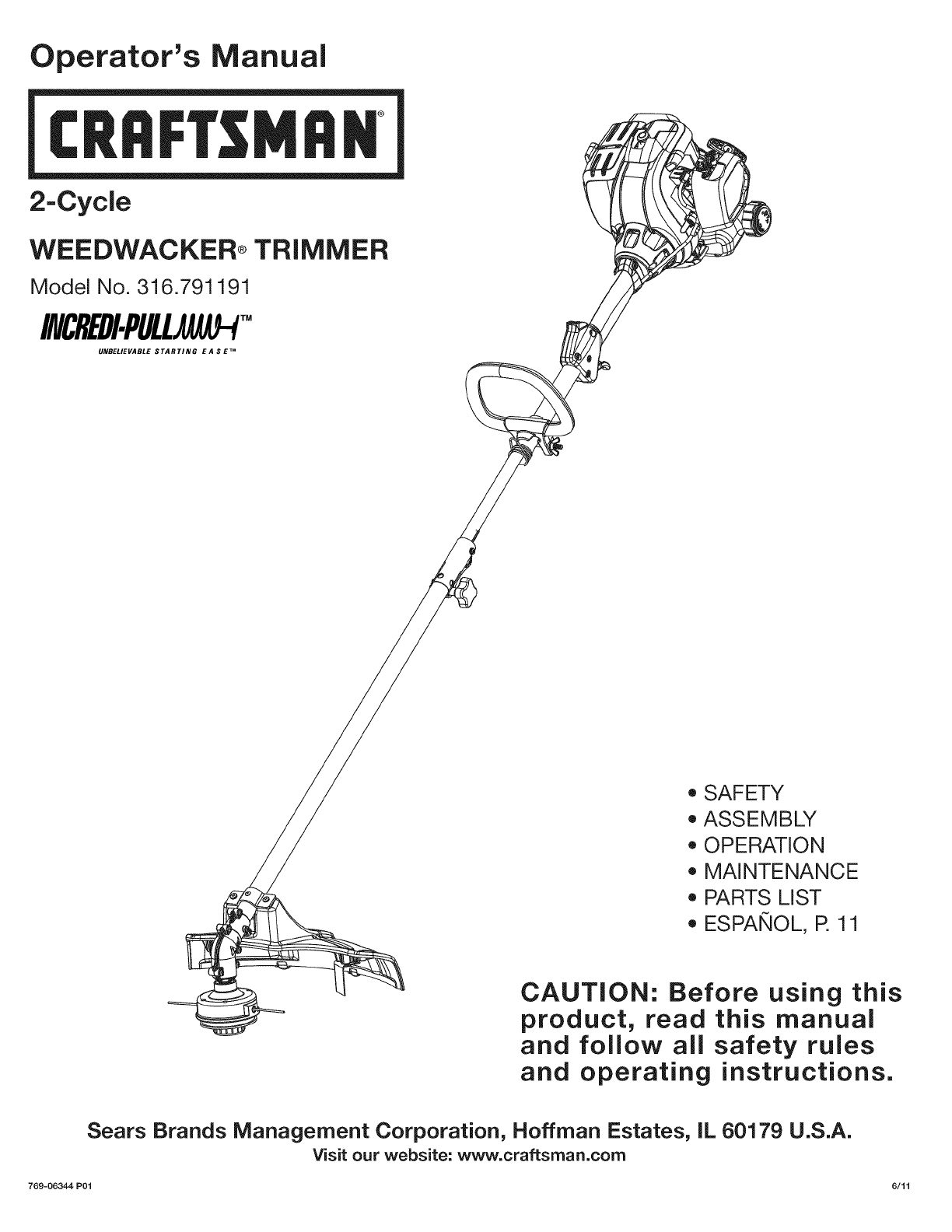User Manual: Craftsman 316791191 316791191 CRAFTSMAN GAS TRIMMER - Manuals and Guides View the owners manual for your CRAFTSMAN GAS TRIMMER #316791191. Home:Lawn & Garden Parts:Craftsman Parts:316791191 Craftsman Grass trimmer (weed wacker) Manual