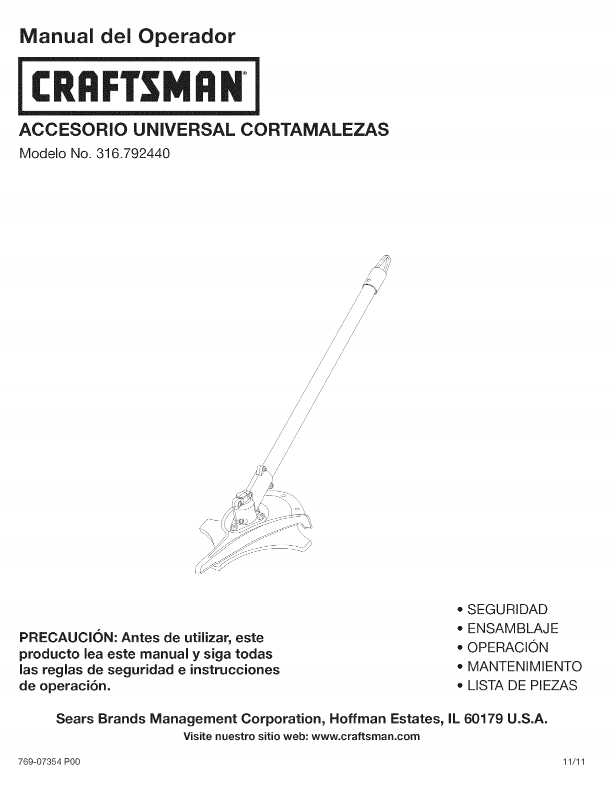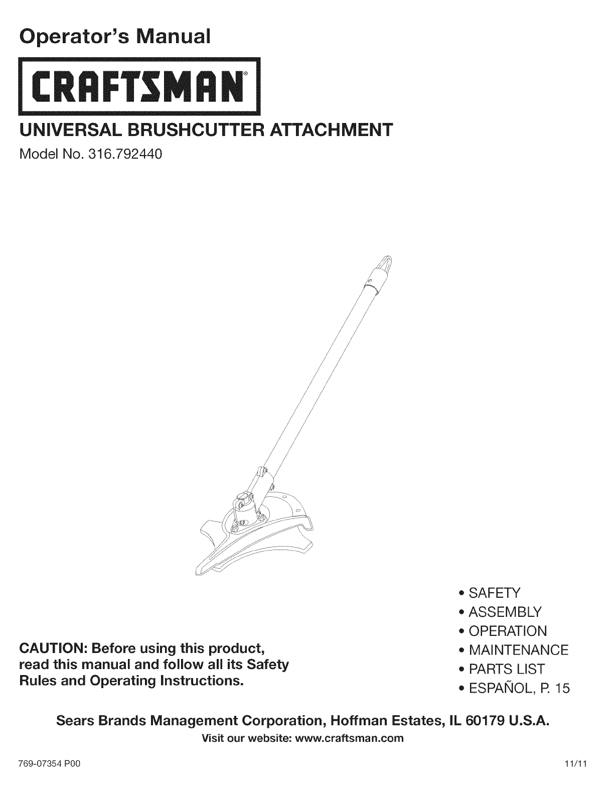 User Manual: Craftsman 316792440 316792440 CRAFTSMAN BRUSHCUTTER ATTACHMENT - Manuals and Guides View the owners manual for your CRAFTSMAN BRUSHCUTTER ATTACHMENT #316792440. Home:Lawn & Garden Parts:Craftsman Parts:316792440 Craftsman Grass trimmer (weed wacker) Manual