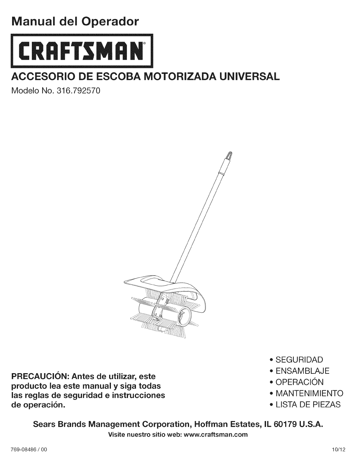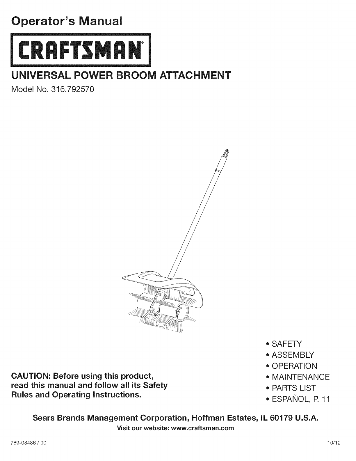User Manual: Craftsman 316792570 316792570 CRAFTSMAN POWER BROOM ATTACHMENT - Manuals and Guides View the owners manual for your CRAFTSMAN POWER BROOM ATTACHMENT #316792570. Home:Lawn & Garden Parts:Craftsman Parts:316792570 Craftsman Grass trimmer (weed wacker) Manual