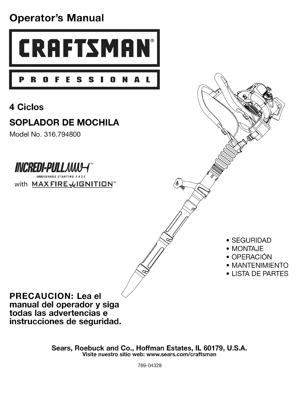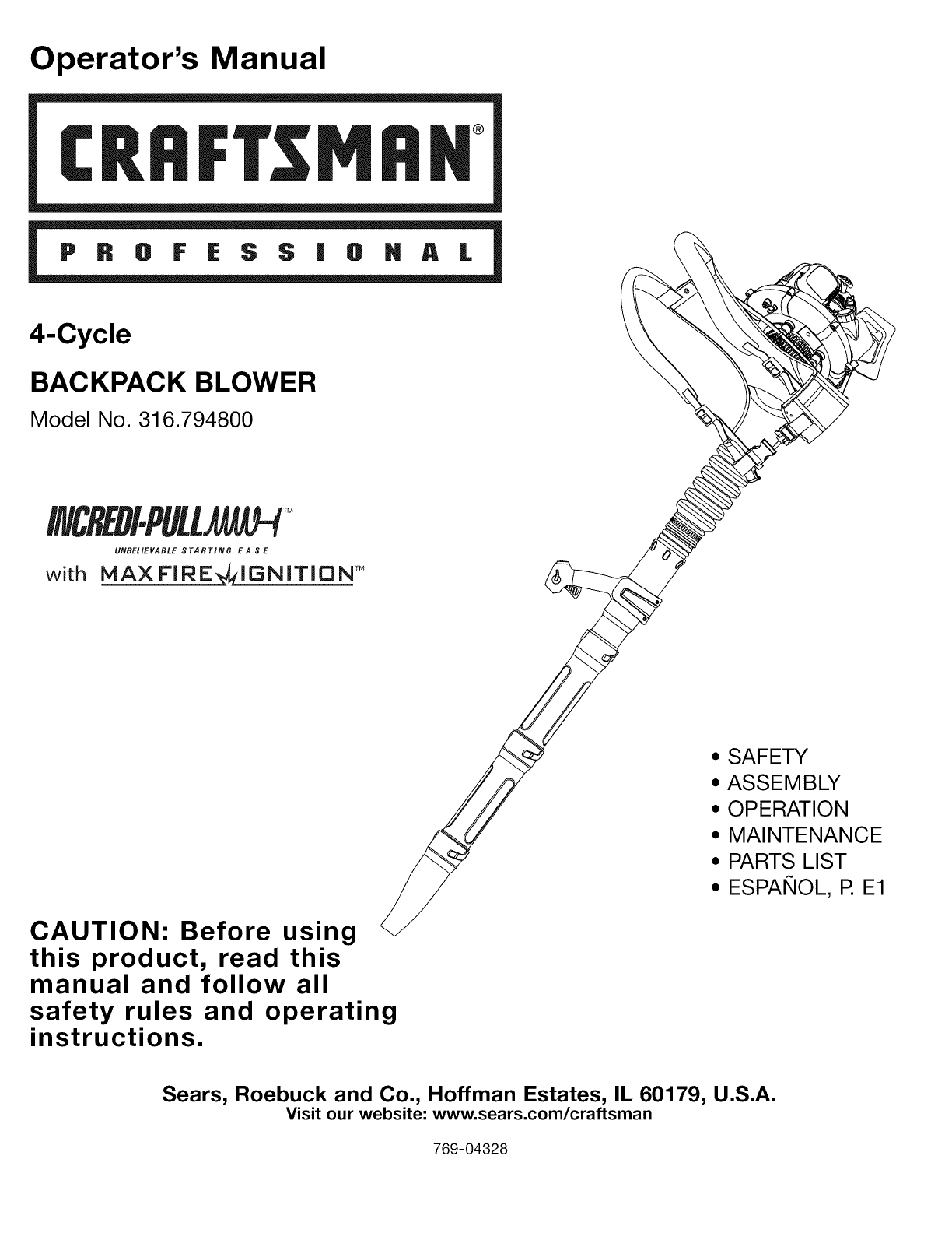 User Manual: Craftsman 316794800 316794800 CRAFTSMAN BACKPACK BLOWER - Manuals and Guides View the owners manual for your CRAFTSMAN BACKPACK BLOWER #316794800. Home:Lawn & Garden Parts:Craftsman Parts:Craftsman BACKPACK BLOWER Manual