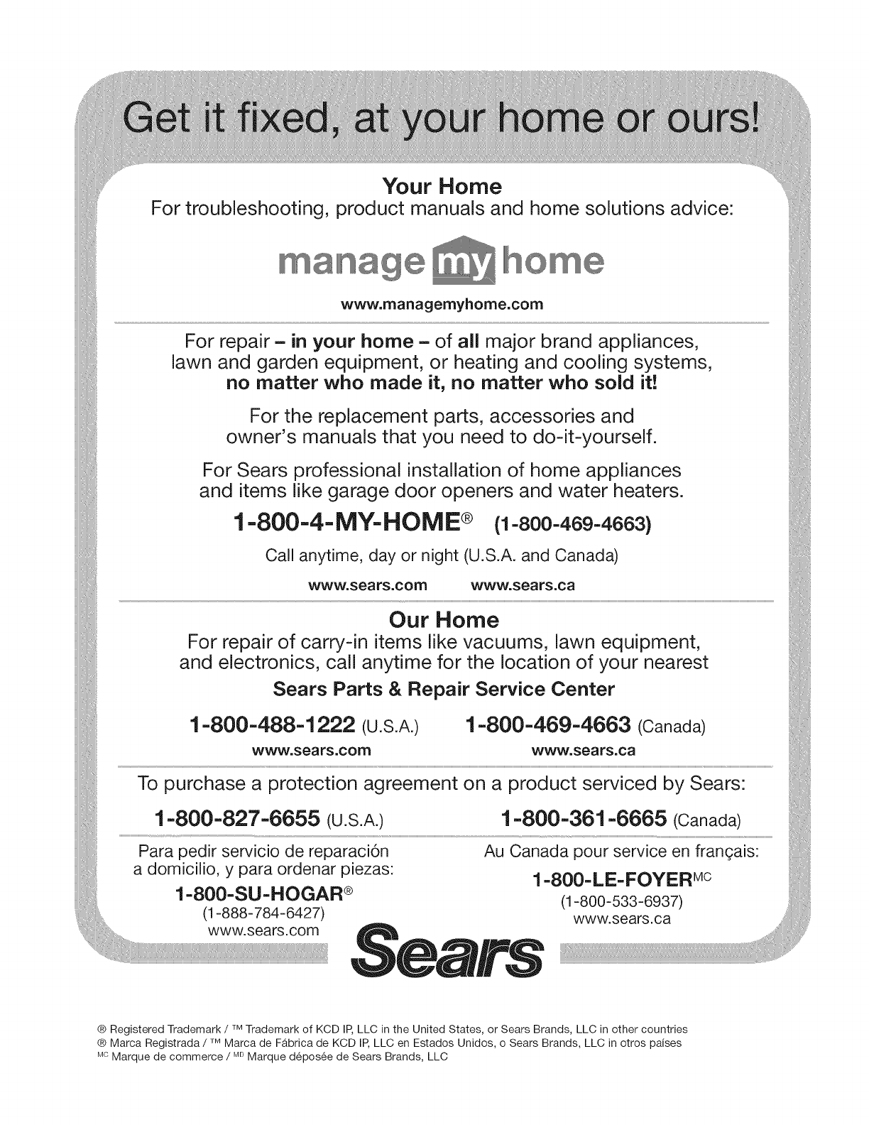 ® Registered Trademark /TMTrademark of KCD IP, LLC in the United States, or Sears Brands, LLC in other countries