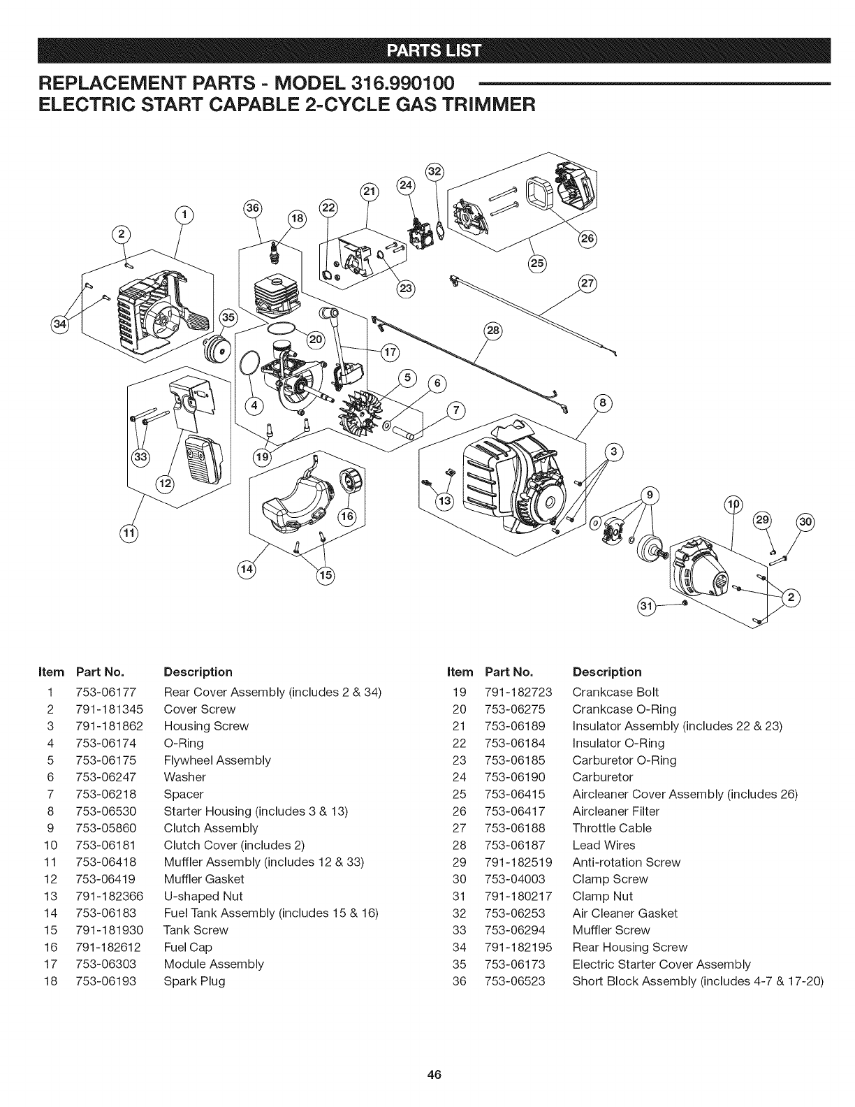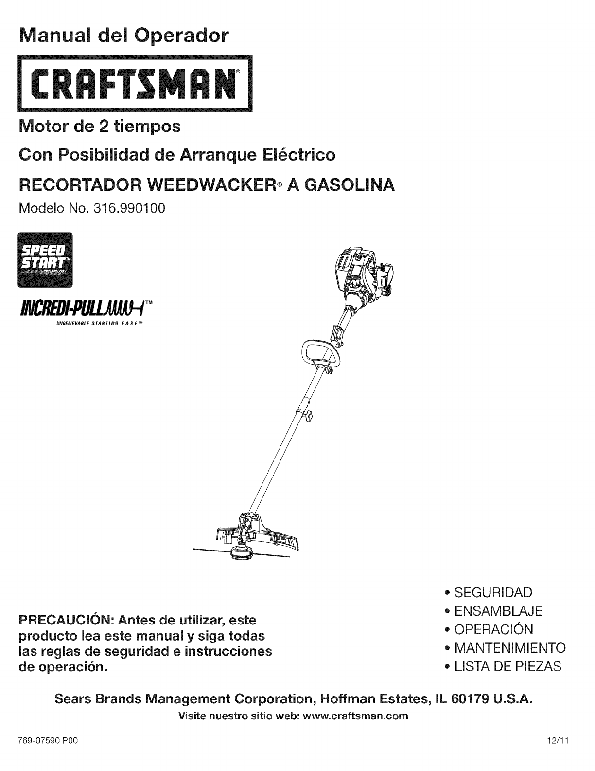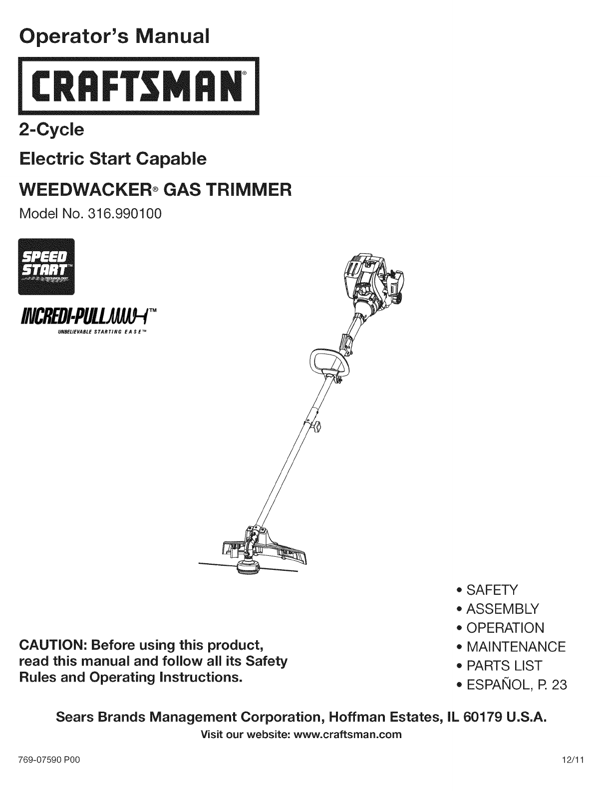 User Manual: Craftsman 316990100 316990100 CRAFTSMAN TRIMMER - Manuals and Guides View the owners manual for your CRAFTSMAN TRIMMER #316990100. Home:Lawn & Garden Parts:Craftsman Parts:316990100 Craftsman Grass trimmer (weed wacker) Manual