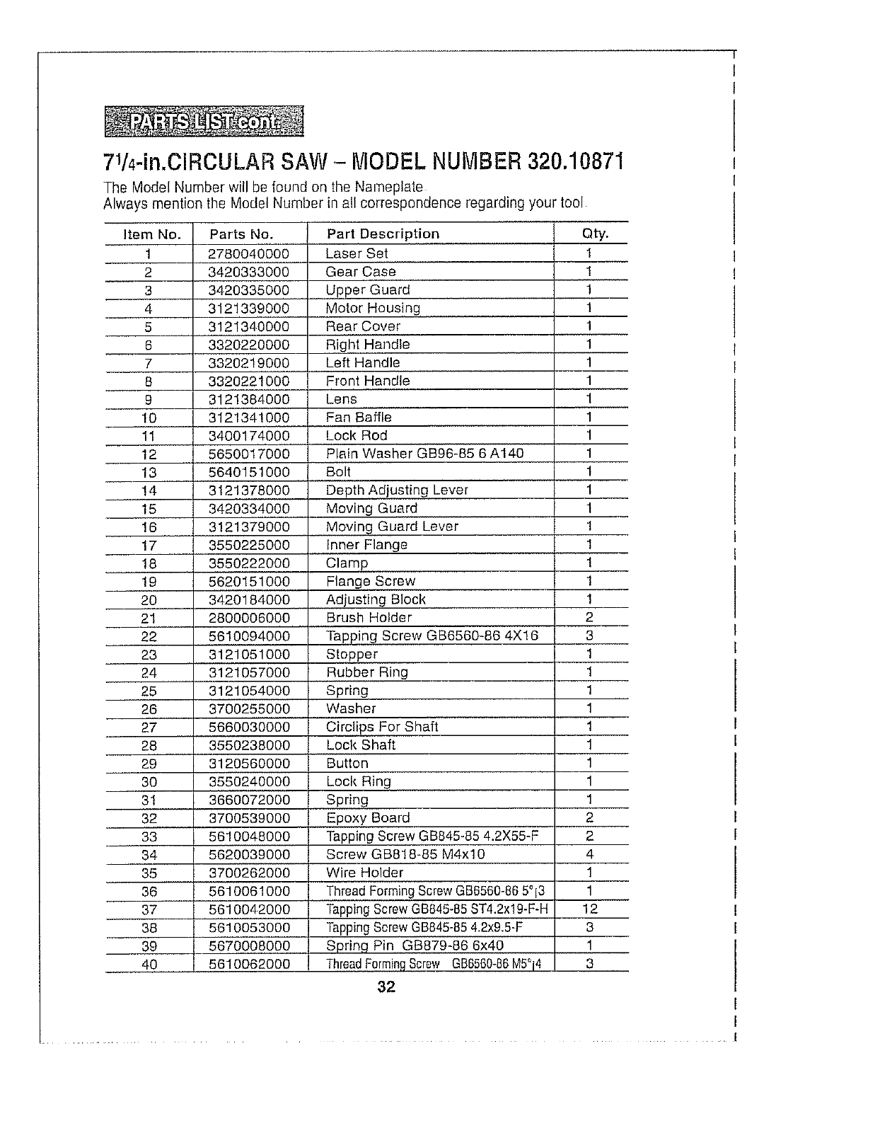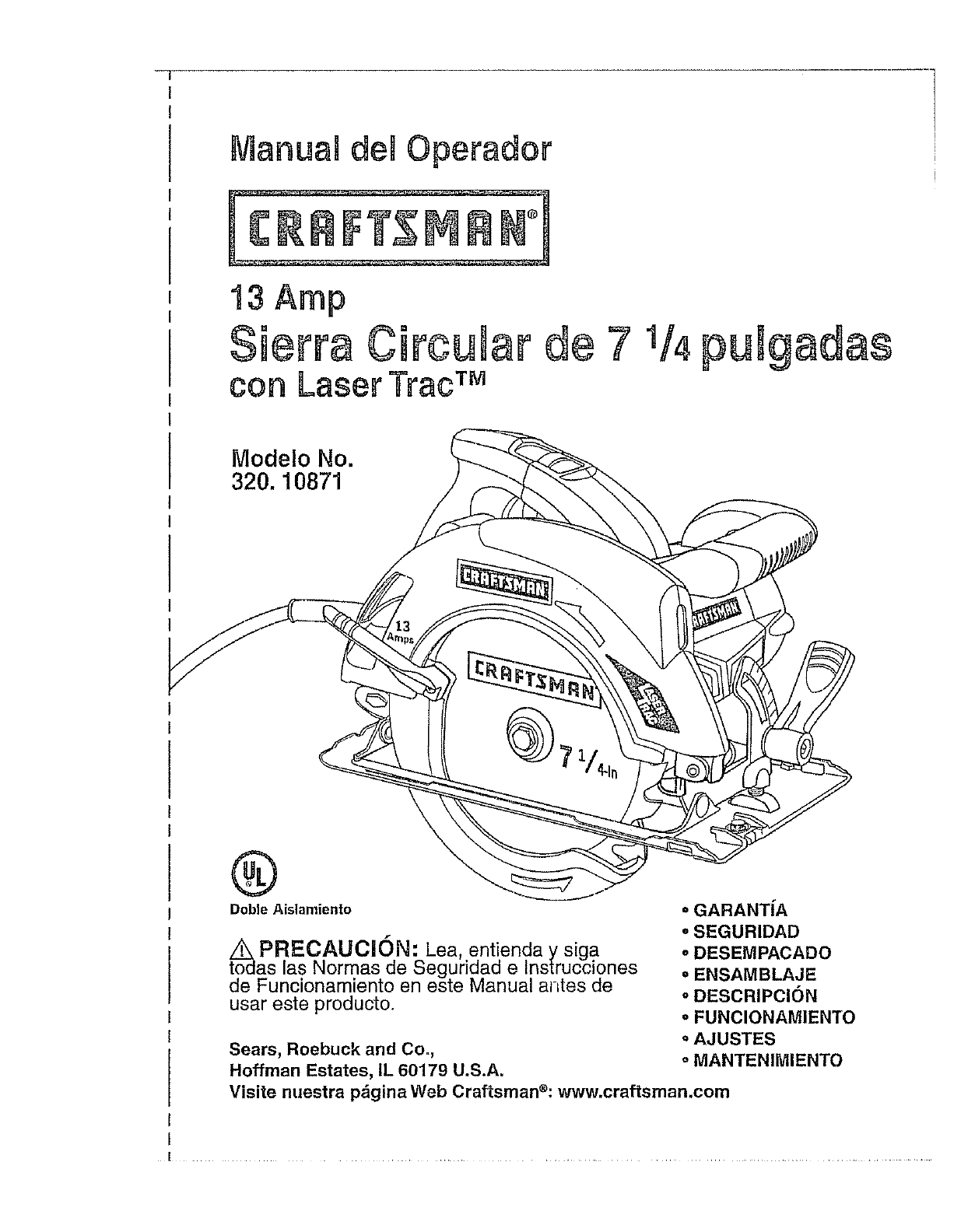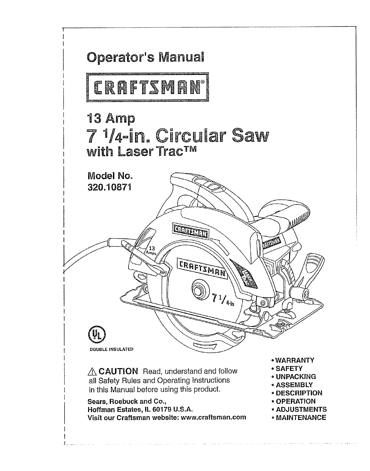 User Manual: Craftsman 32010871 32010871 CRAFTSMAN CIRCULAR SAW - Manuals and Guides View the owners manual for your CRAFTSMAN CIRCULAR SAW #32010871. Home:Tool Parts:Craftsman Parts:Craftsman CIRCULAR SAW Manual