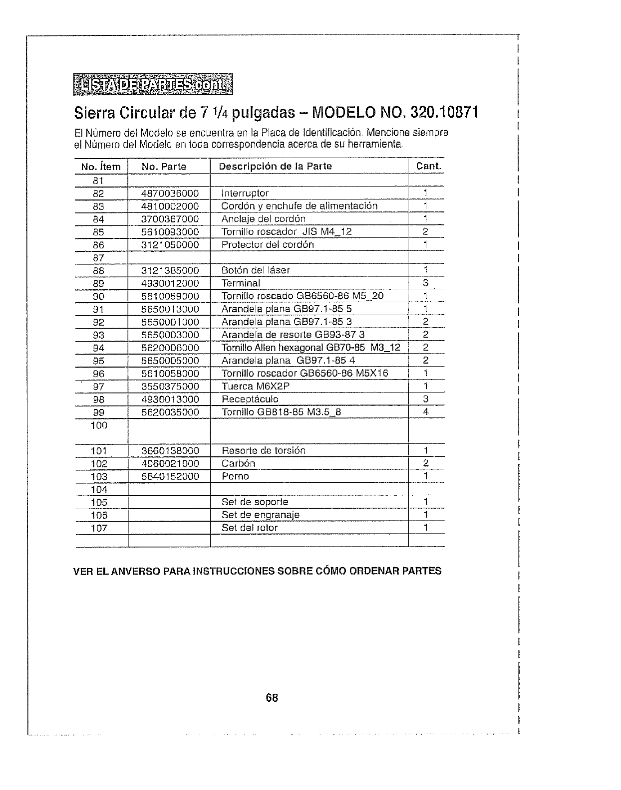 VER EL ANVERSO PARA INSTRUCClONES SOBRE COMO ORDENAR PARTES