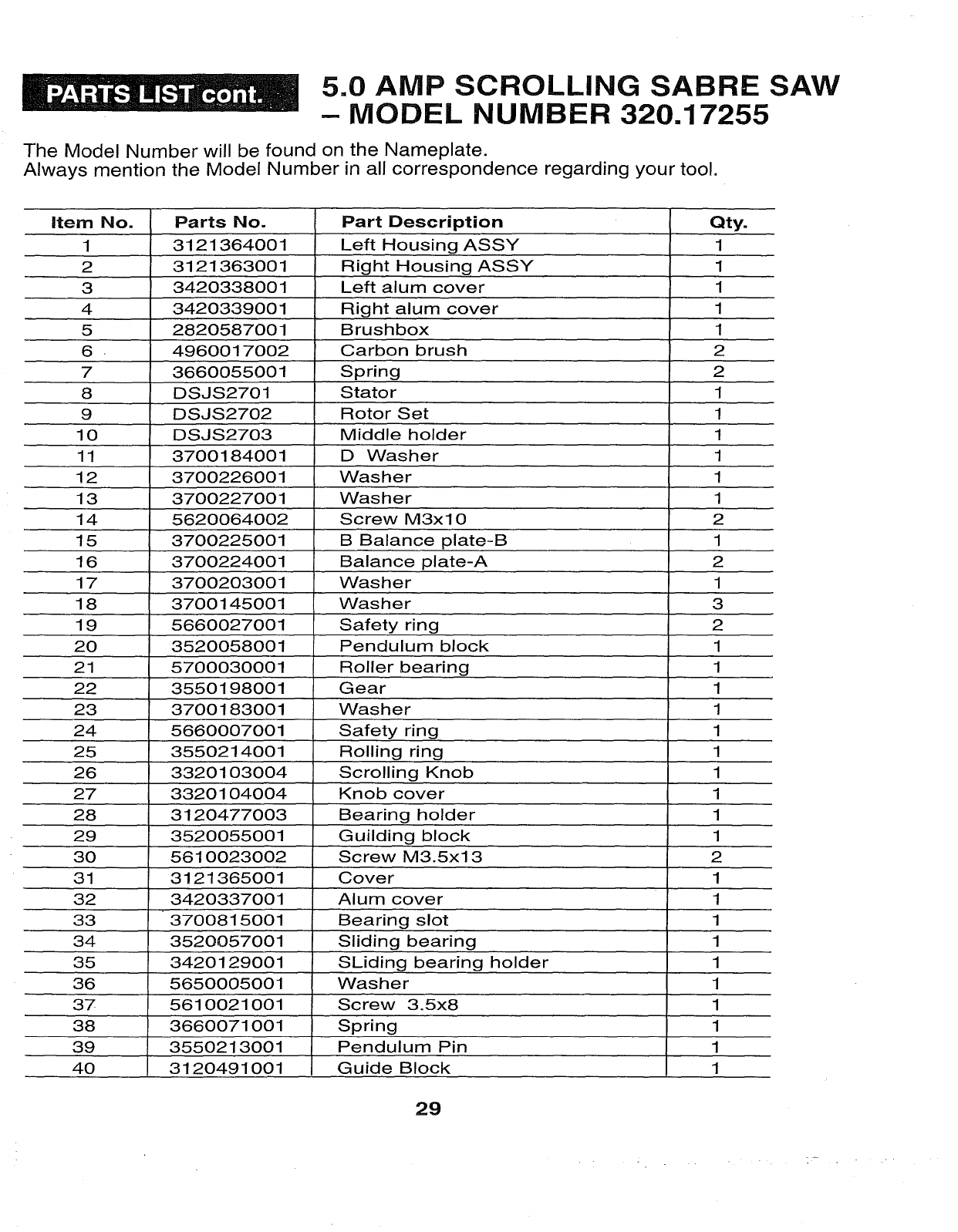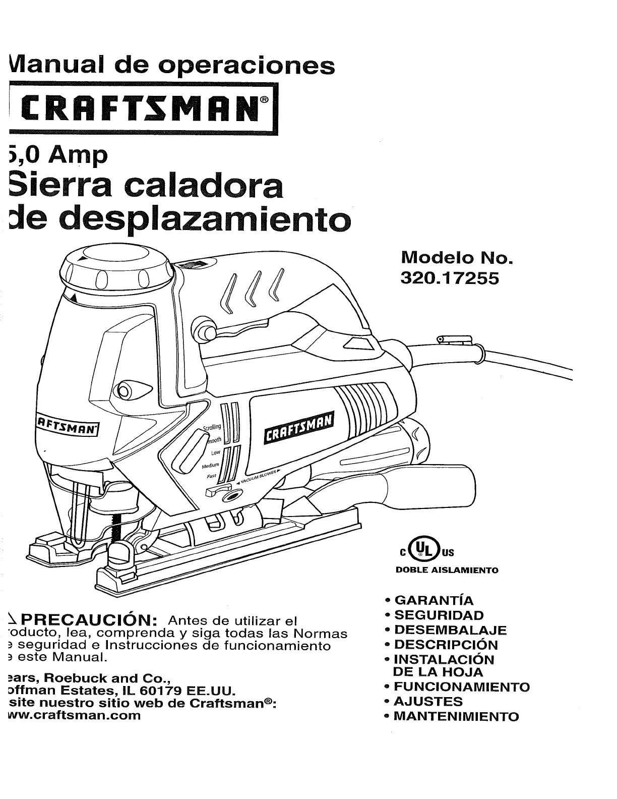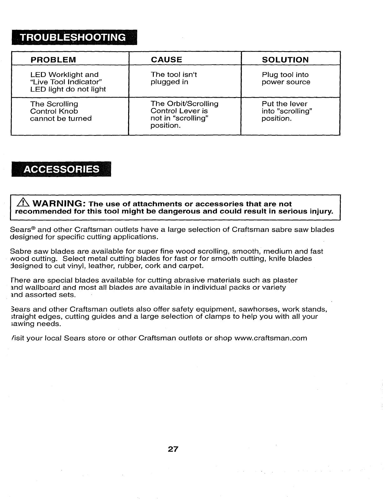 User Manual: Craftsman 32017255 32017255 CRAFTSMAN SCROLLING SABRE SAW - Manuals and Guides View the owners manual for your CRAFTSMAN SCROLLING SABRE SAW #32017255. Home:Tool Parts:Craftsman Parts:Craftsman SCROLLING SABRE SAW Manual